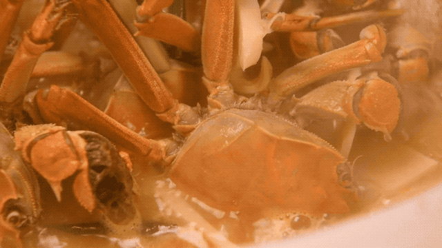 接下来的中方湖蟹一锅鲜,将火腿和蟹组合在一起,其鲜无比。火腿中方切片,少油煸香,再放入砂锅内与太湖蟹慢炖。