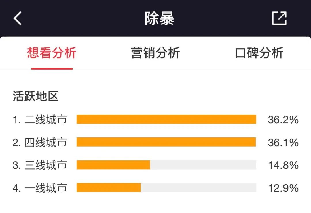 同时,这类型影片观影门槛低,以快节奏、强情节特色吸引观众,下沉力度强,能够激发更广泛观众。如《除暴》的观影画像当中,四线城市占比高达36%,这一数据远超同期影片,也正是足够下沉让影片具备更强大的市场影响力。