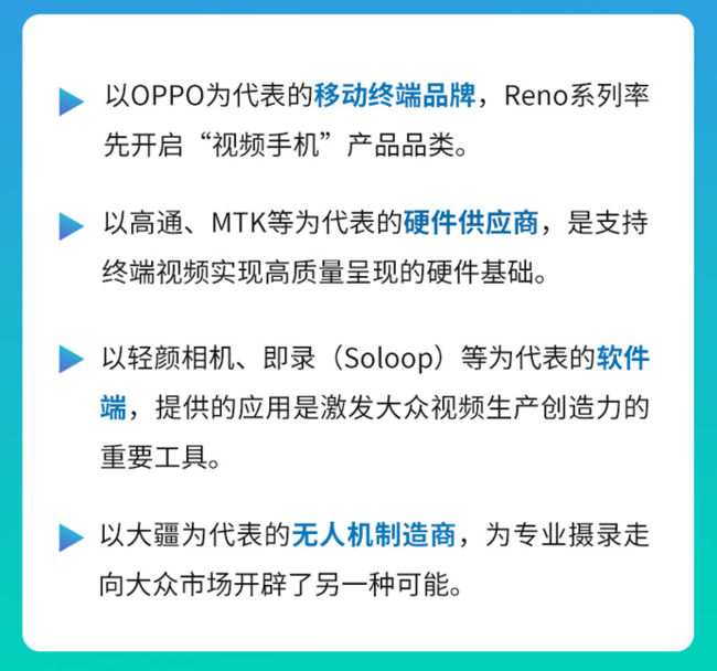 手机作为大家触手可及的设备,在如今常态化的视频拍摄中有着先天优势,而超高清内容、高速5G网络等条件的成熟又打下了新的基础,所以视频成了业界公认的下一波浪潮,早早凭借Reno系列主打视频拍摄,开启“视频手机”品类的OPPO也成了报告中总结视频产业生态链移动中端品牌的代表。