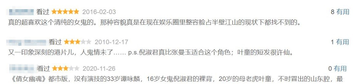 不过事实证明,选倪淑君是对的,30多年过去,有网友在豆瓣留言说:“倪淑君真的比张曼玉适合这个角色”“超喜欢这个清纯的女鬼,那种容貌在当下的整容脸占了半壁江山的娱乐圈里是找不到的”。