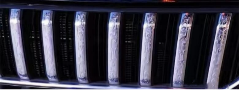 外观部分,新车前脸高大方正,引擎盖上使用复古的红旗传统立标,非常抢眼的是直瀑式镀铬格栅,九条粗壮的格栅每个上面都有龙纹装饰,搭配左右两个硕大的灯组显得不怒自威。