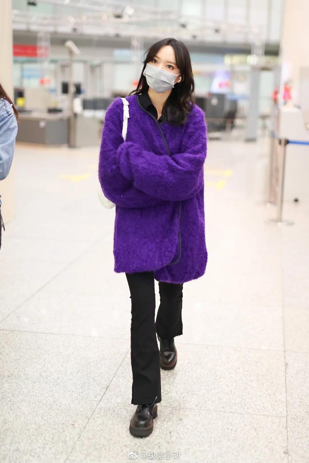 程潇真是青春靓丽,身穿紫色毛绒外套搭配白色腋下包,时尚感满分了!
