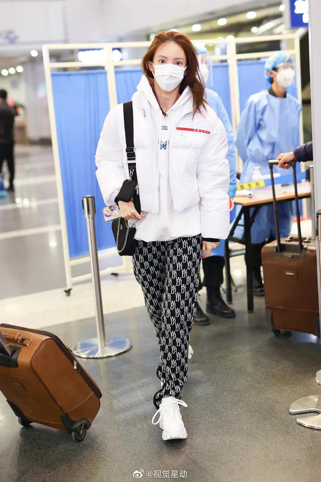 金晨穿了一件白色短款羽绒服搭配同色卫衣,下面穿了条黑白菱形格纹的直筒裤,脚上穿双小白鞋。貌似她最近还蛮喜欢这条格纹裤子的,出现好多次了,很舒适的感觉。