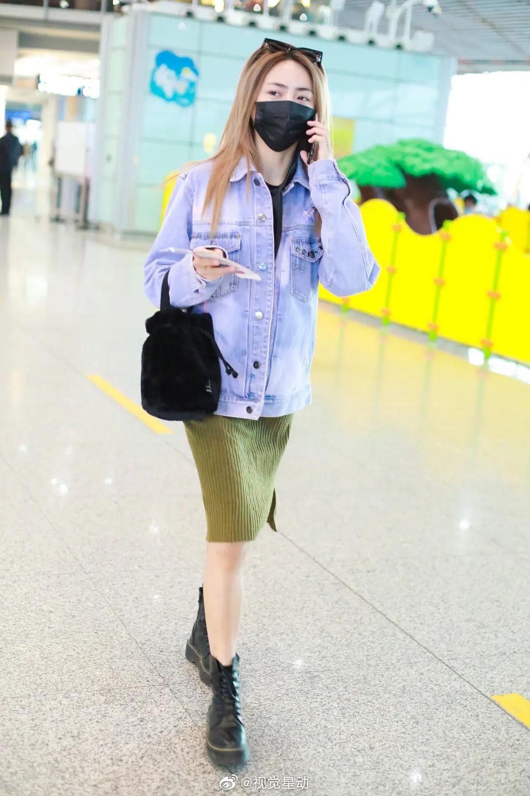谢可寅这张是全素颜生图,破洞做旧牛仔外套搭配橄榄色针织半裙,干干净净的,但是这个腿看起来有点冷啊。