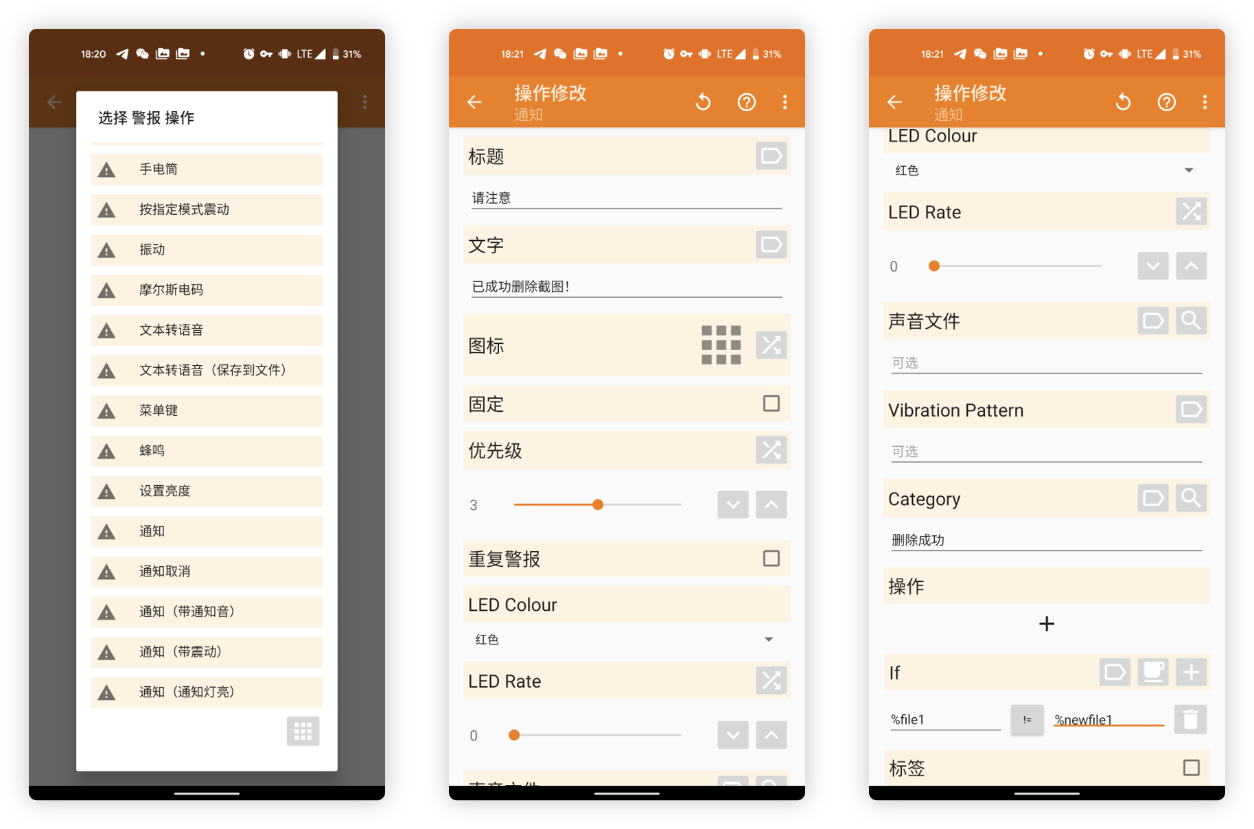 然后添加新步骤追加截图成功删除的通知,选择「警报 > 通知」并填写标题、文字以及 Category。在 If 栏目下选择 %file1 != %newfile1,以此来匹配删除前后的文件夹中第一个文件的路径信息是否一致,便可以在满足该条件时才执行通知。