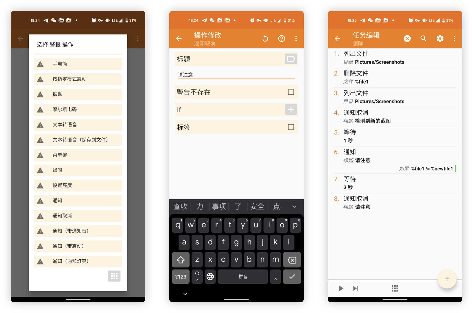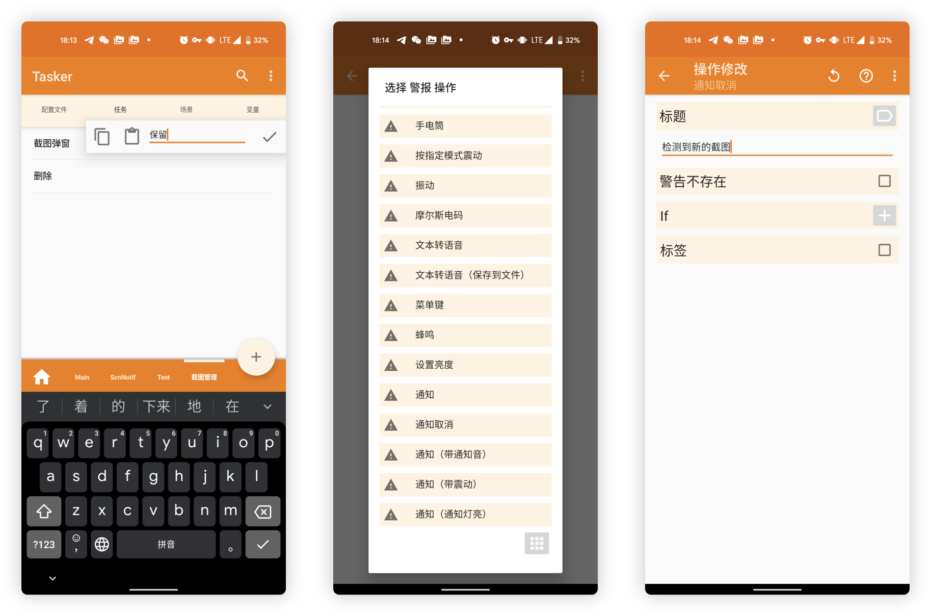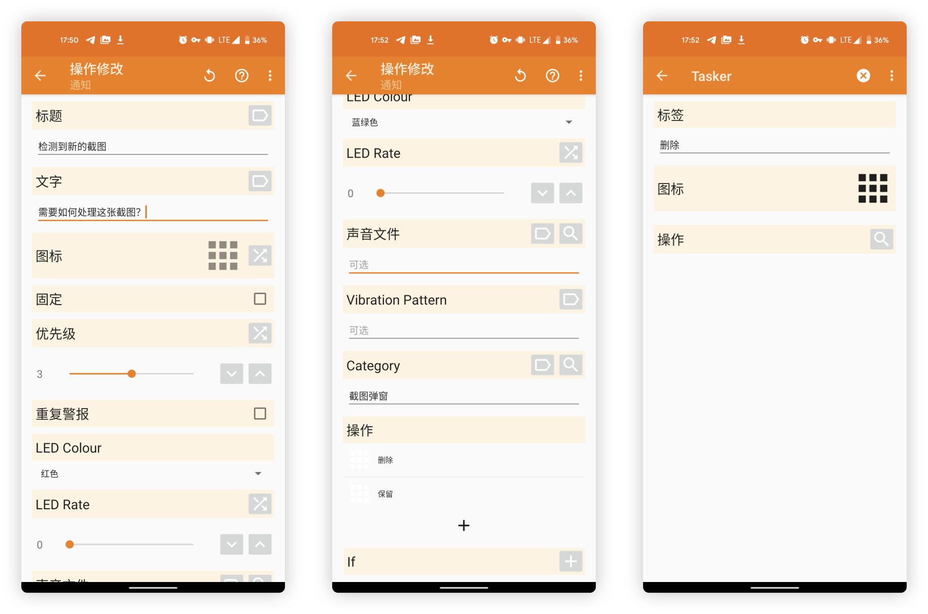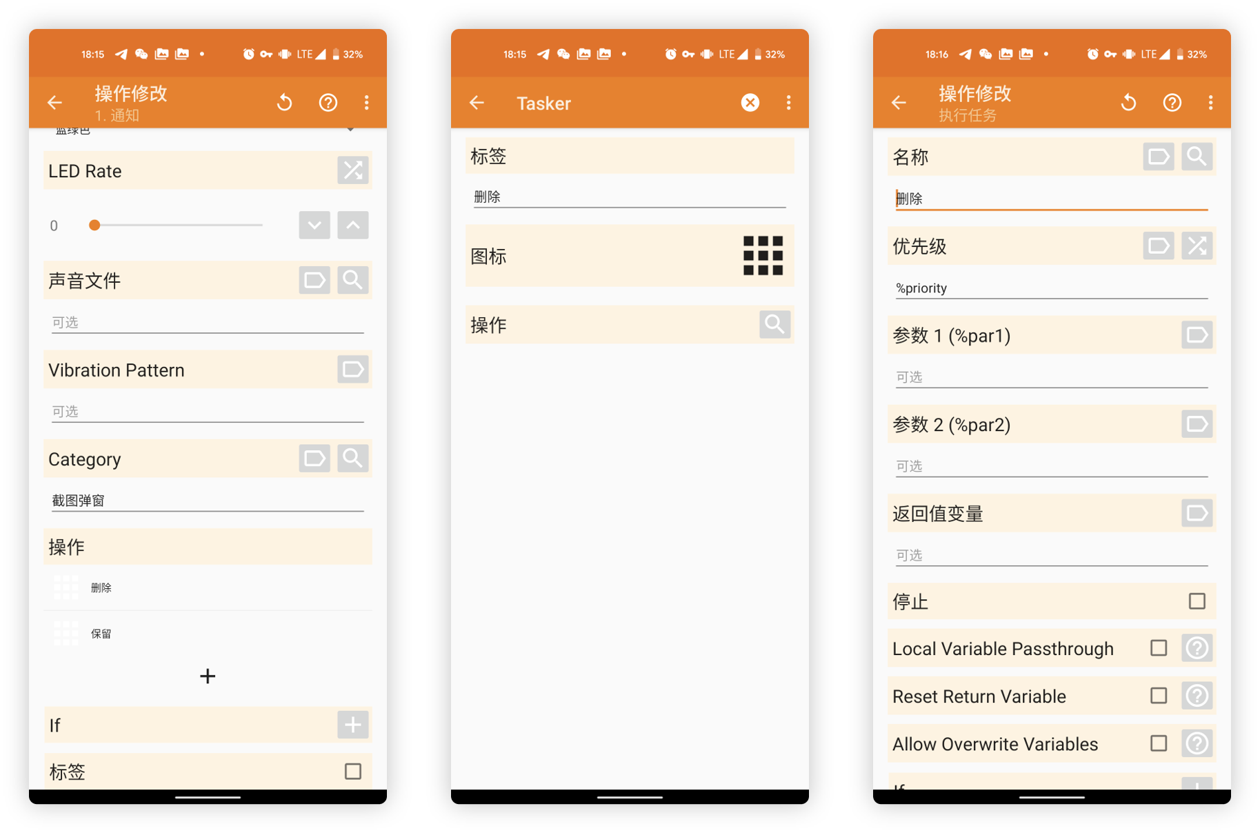 上面所建立的删除和保留按钮,在最终通知中表现为两个可以操作的动作按钮,而在 Tasker 中进行设定时,我们则可以将其理解为两个不同的「任务」,具体的任务会在我们点击各自通知按钮的时候执行—— 有那么点「套娃」的意思。