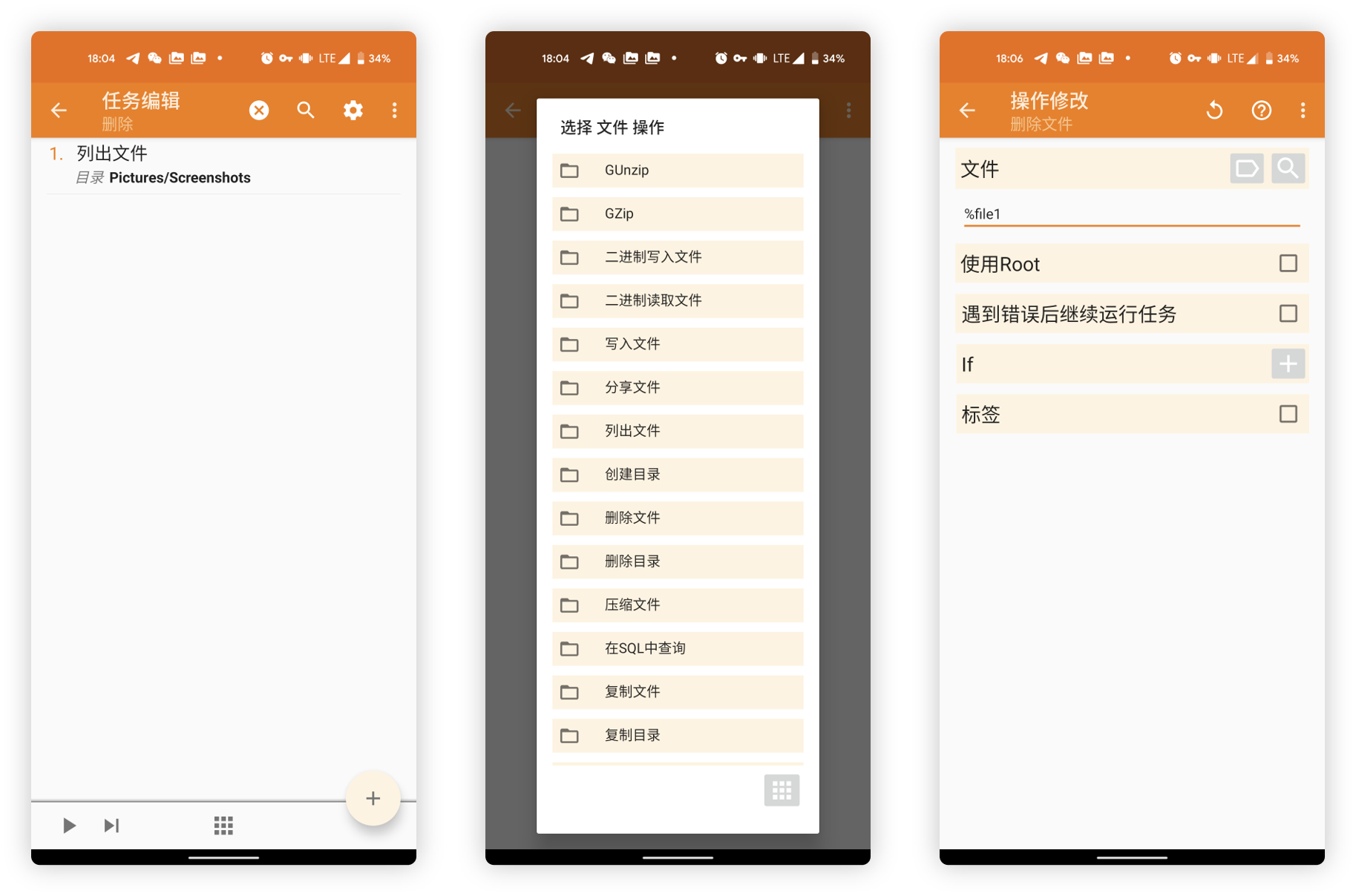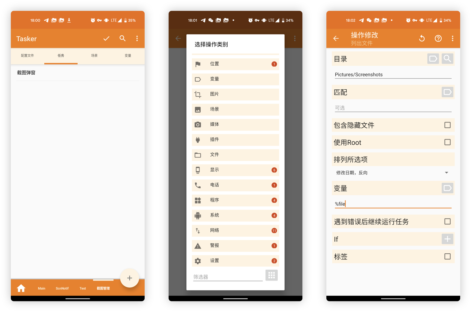 在 Tasker 顶部选择「任务」一栏,点击左下角的 Add 按钮添加一个「任务」。命名为 删除 后,按照上述流程添加步骤,选择「文件 > 列出文件」,然后在目录标签下选择截图所在的文件夹「Pictures > Screenshot」,排列选项栏目选择「修改日期,反向」,变量填写 %file ,最后返回保存设置。