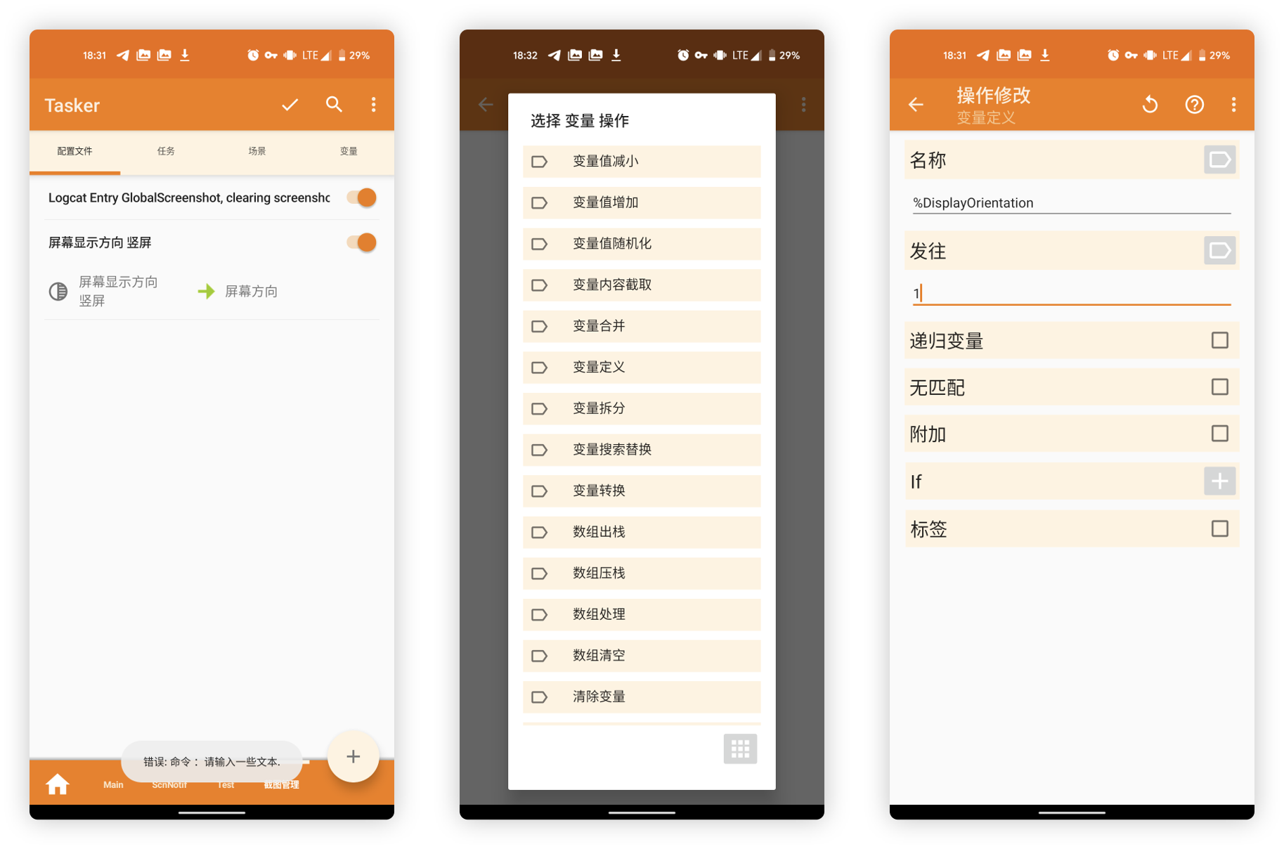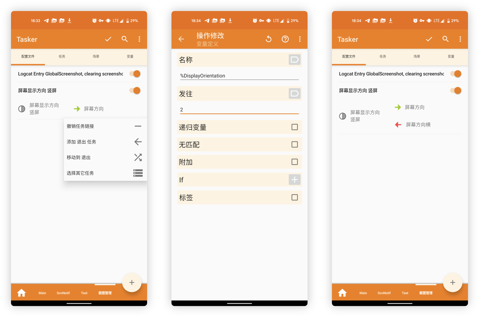 长按右侧的 屏幕方向 任务,选择添加退出任务,命名为 屏幕方向横,并再次选择「变量 - 变量定义」,名称定义为 %DisplayOtientation,发往填写 2。这样一来便可以实现在非竖屏情况下,变量的数值切换为 2。
