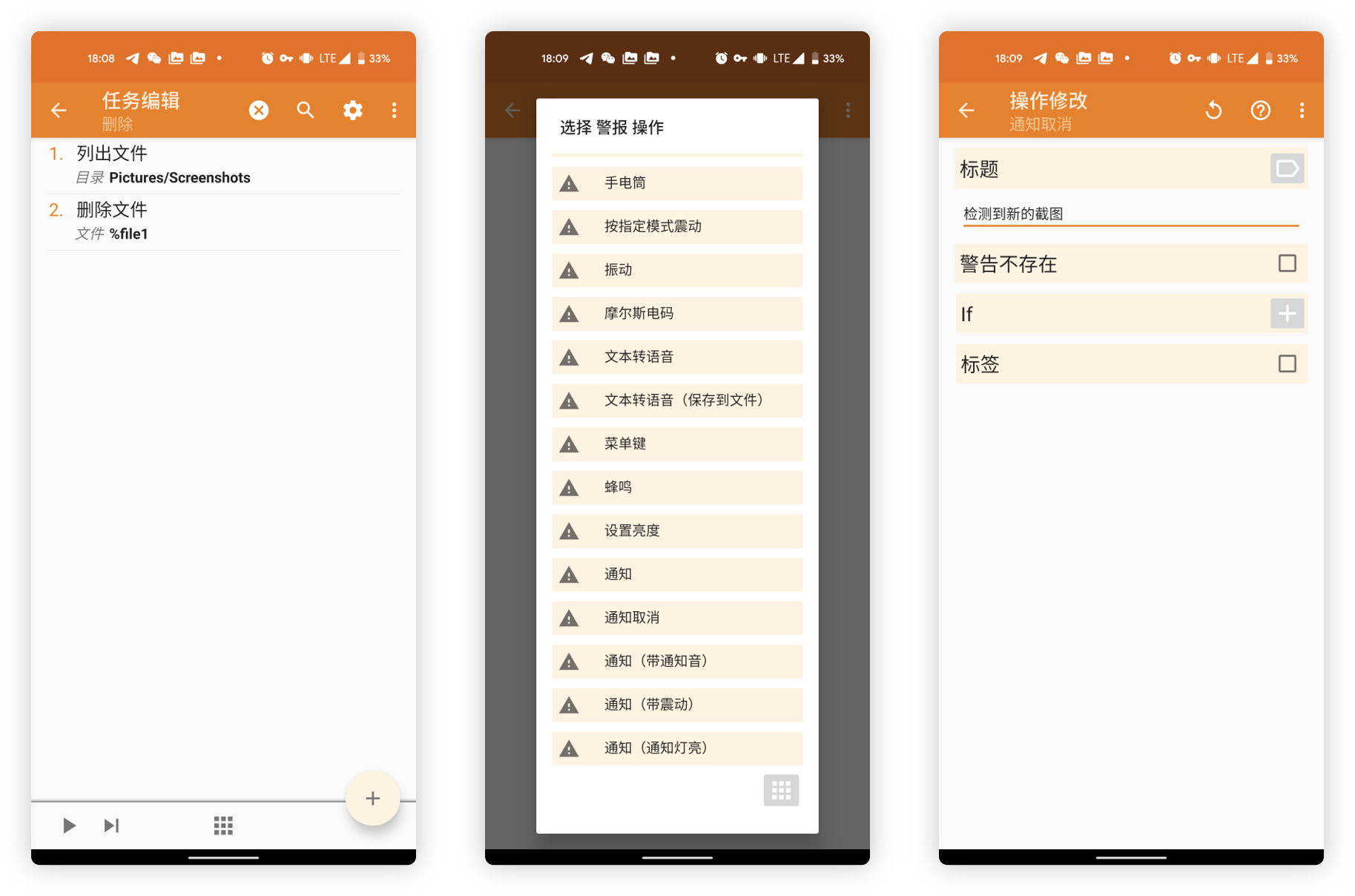 因此在完成对「删除截图」这一核心操作的配置后,我们还需要继续添加步骤,选择「警报 > 通知取消」,在标题中填写之前通知设定的标题信息即可。完成后退回至任务界面后,删除按钮的配置步骤这才算完成了。