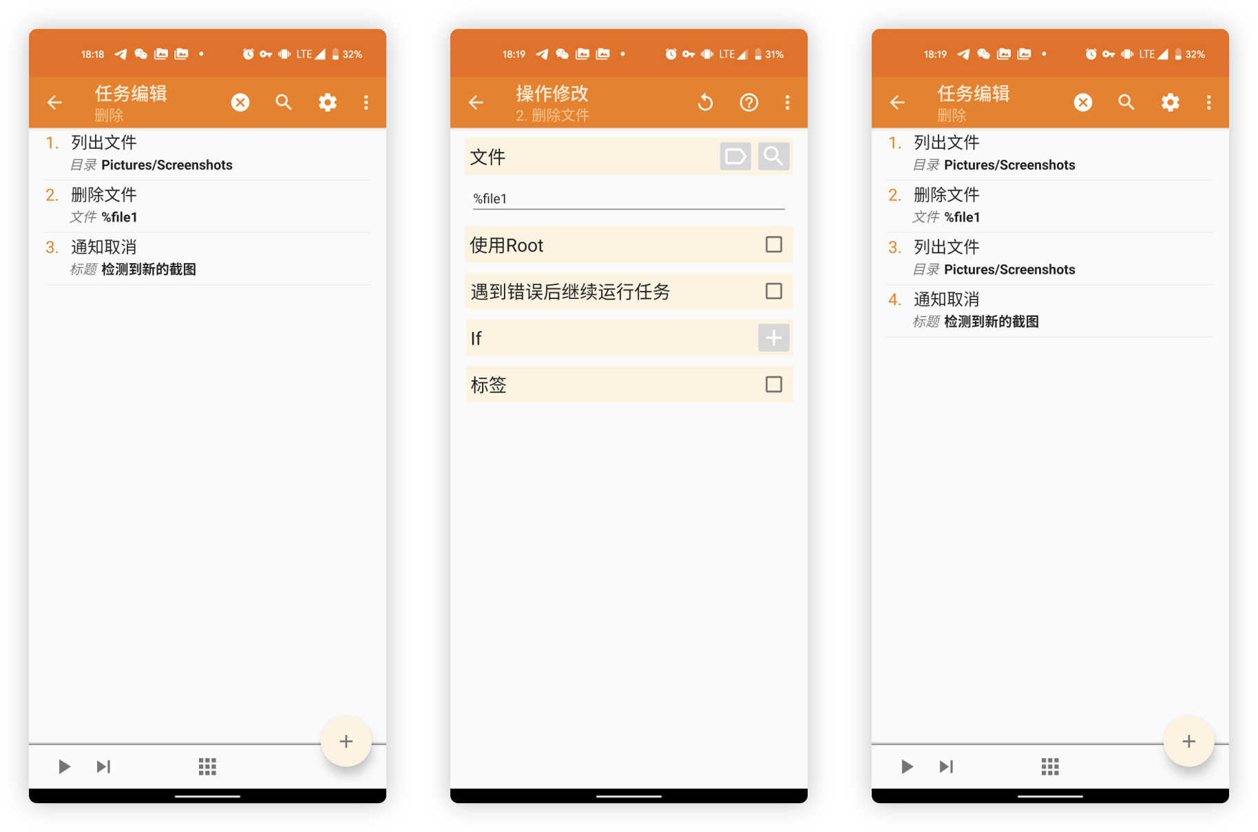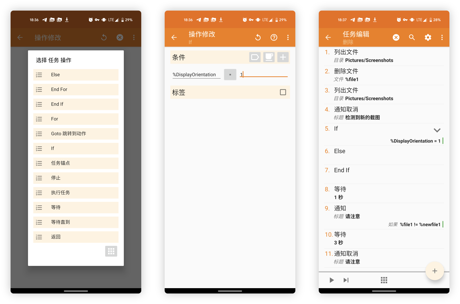 拥有条件变量以后,便可以回到 删除 任务的步骤中,添加判断和点击步骤。首先选择添加「任务 - If」,条件设定为 %DisplayOtientation = 1,即屏幕显示方向为竖屏时。最后插入操作选择「If > Else > End If」,并将三个步骤拖拽至第四步通知取消之后。