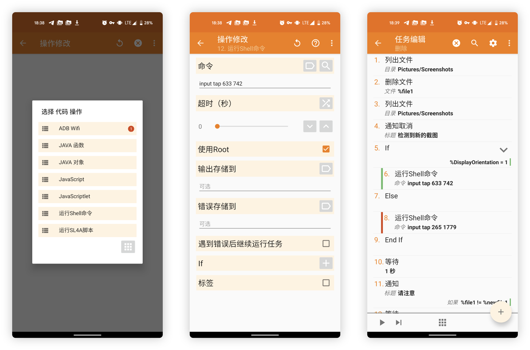 再添加两个点击操作,分别对应横屏和竖屏的点击。选择添加「代码 > 运行 Shell」,分别在命令中填写 input tap 633 742 和 input tap 265 1779,同时勾选使用 Root。返回后将两个指令分别拖拽至 If - Else 之间以及 Else - End If 之间。