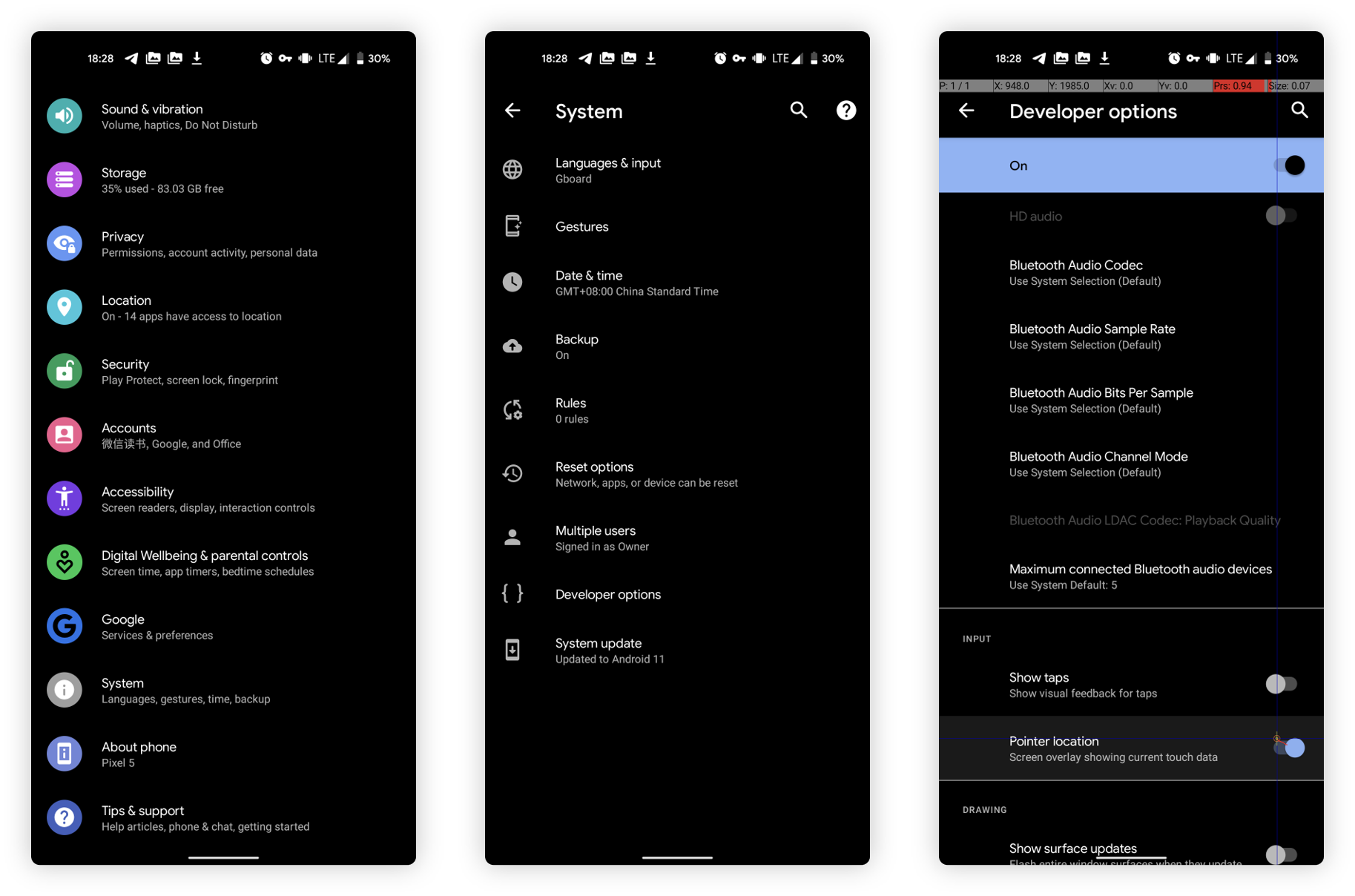 首先,进入 Android 的「设置 > 系统 > 开发者选项」,在输入标签下打开指针位置。在屏幕左上方的 X 以及 Y 的数值便是触控点位的坐标。在横屏以及竖屏状态分别截图后,定位至取消按钮处即可。获得 Pixel 5 的相关坐标信息如下(不同设备的点位可能存在差别,以下数据不通用):
