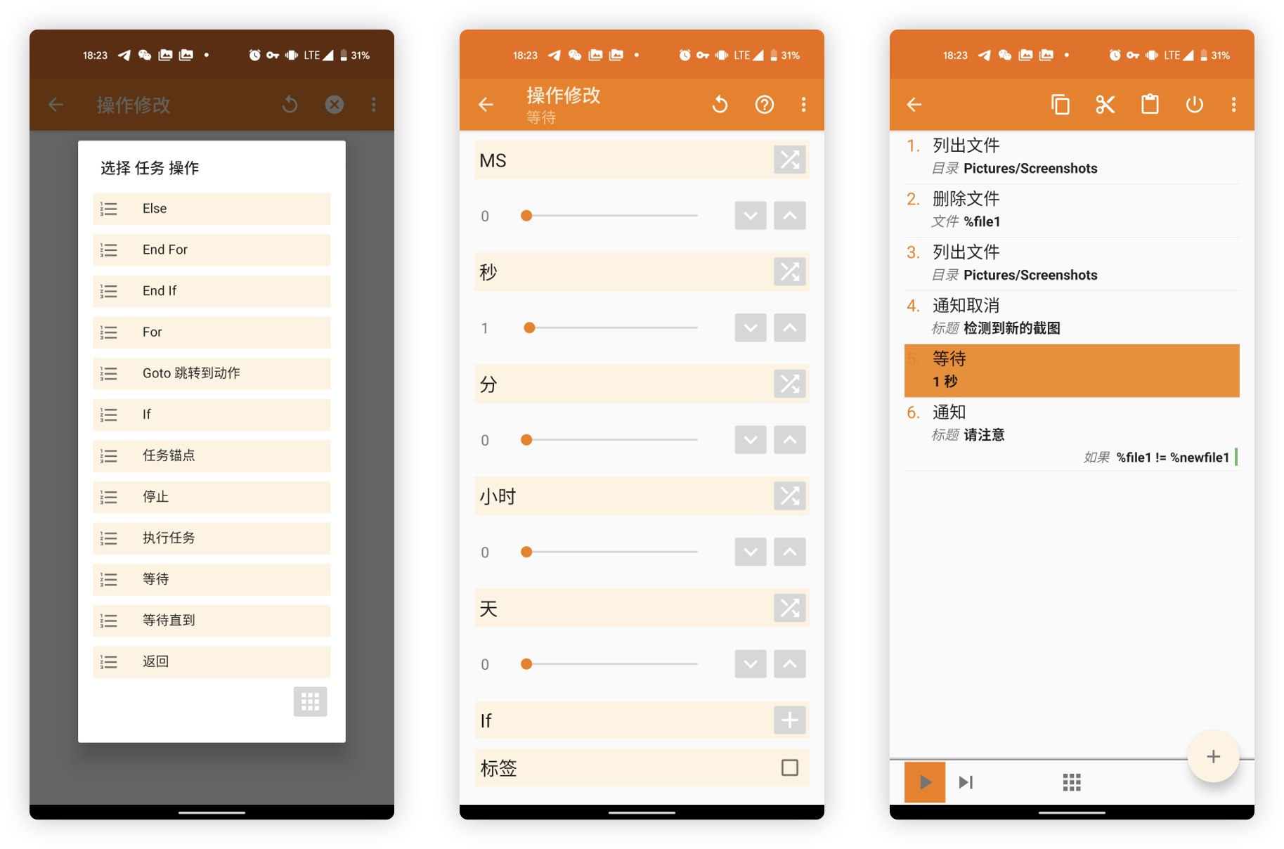 为了避免截图通知弹窗点击删除后,立刻弹出删除成功的通知而显的较为生涩。可以添加新步骤,选择「任务 > 等待」,设定 1 秒等待时间。设定完成后,将等待步骤拖拽至删除成功通知步骤之前。