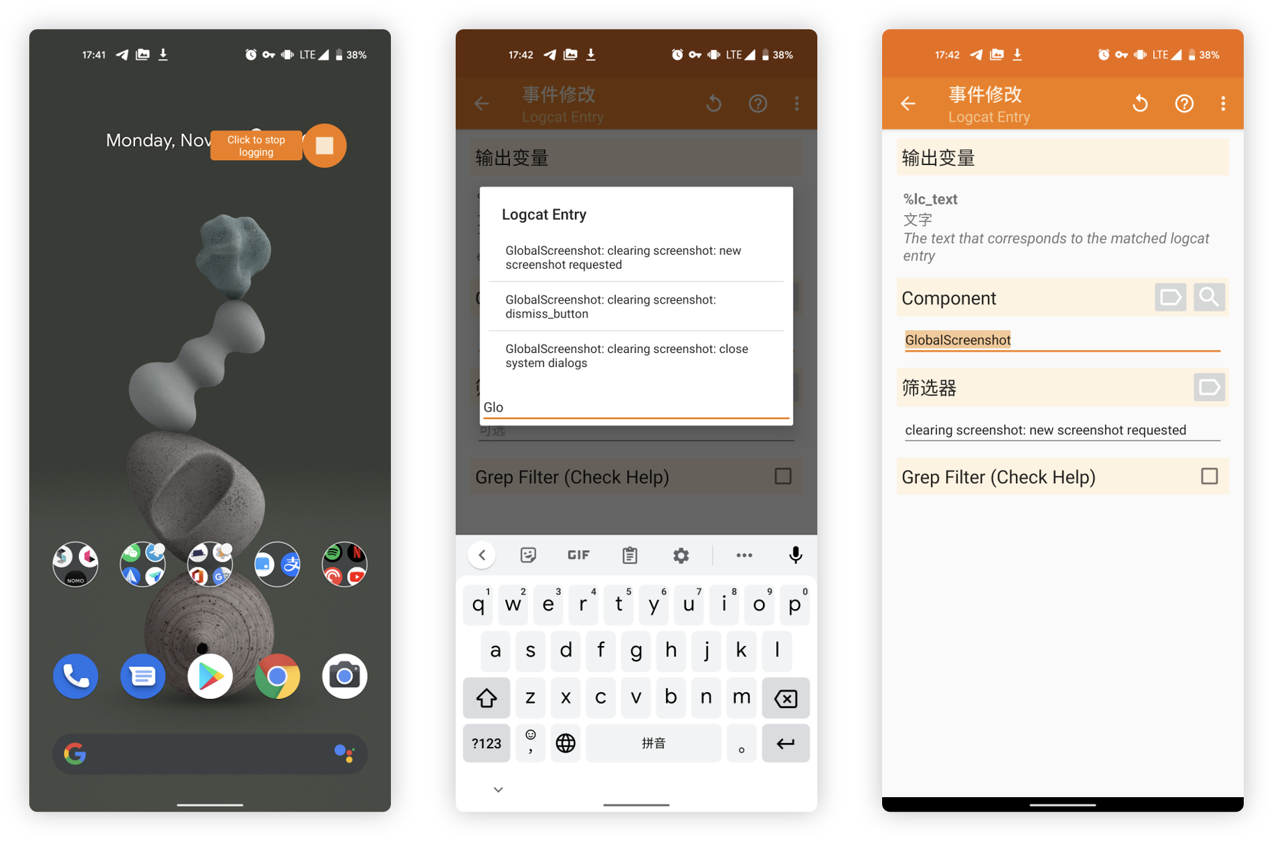 点击开始后,我们只需要像平时一样正常执行截图操作,完成后再点击 Tasker 浮窗停止即可。停止后返回 Tasker,我们就得到了刚才这时间里的系统日志,随后通过检索关键词 screenshot 来获得相关字段。其中 GlobalScreenshot: clearing screenshot: new screenshot requested 就是截图的事件信息,单击选项即可完成填充。