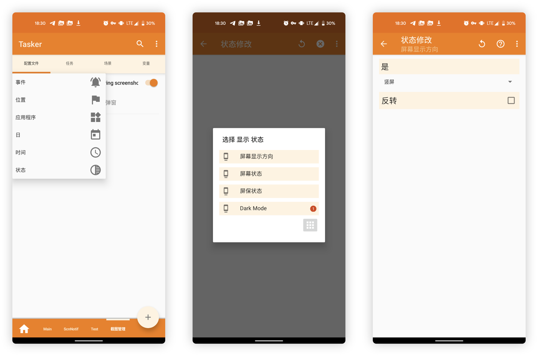 由于横竖屏的状态没有作为内置变量可以直接使用,所以需要将显示方向作为条件去定义变量信息。在配置文件栏目,点击左下角的 Add 按钮添加一个「条件」,并在列表中选择「状态 > 显示 > 屏幕显示方向」,确认设置为竖屏后返回。