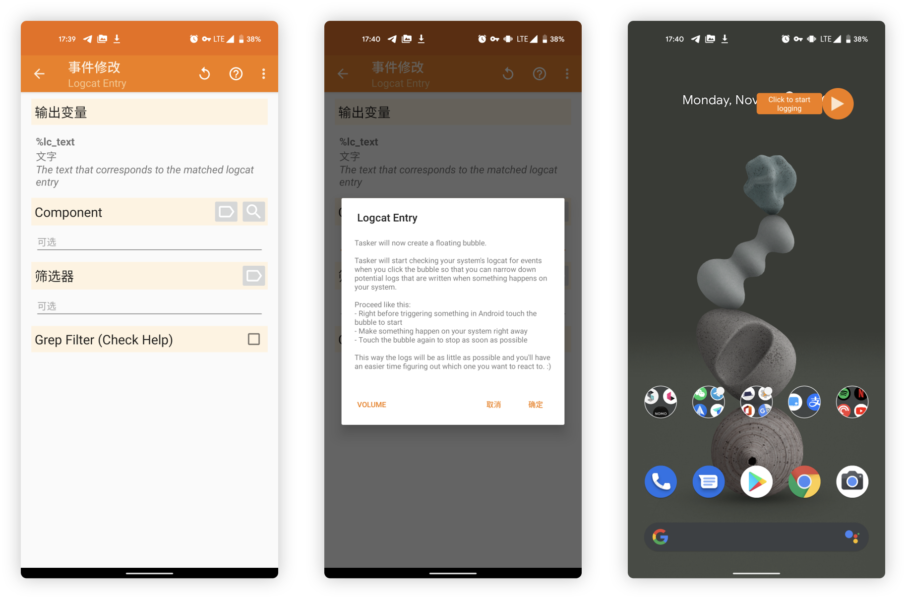 由于并不知道截图操作在系统日志中的具体信息,这里我们需要借助 Tasker 的采集功能进行定位。点击 Component 标签中的放大镜按钮,弹窗选择确定后 Tasker 会生成一个浮窗开始按钮。