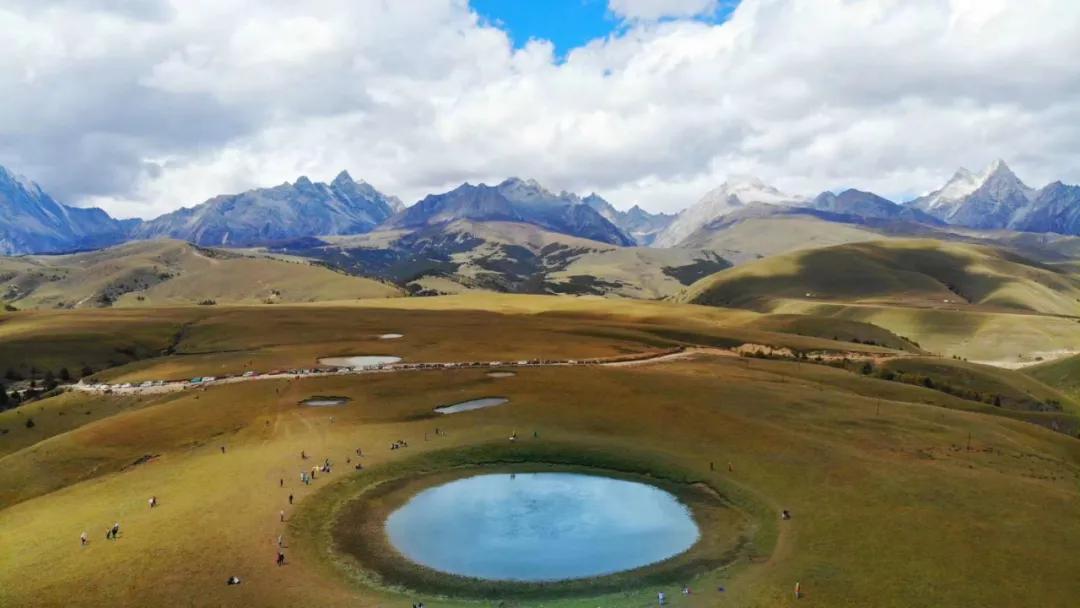 这只大自然的“眼睛”是观赏格聂群峰的最佳位置,草甸平坦开阔、视野没有遮挡,七座山峰一字排开,山体宏大,岩石裸露。