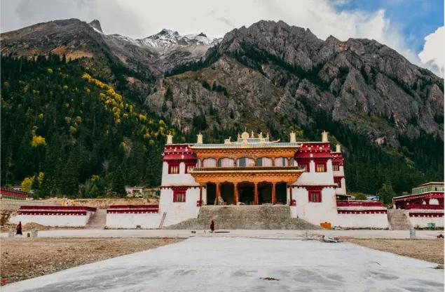 新冷谷寺,闪耀的藏式建筑群铺展在神山脚下、草原尽头,清冷而庄严。