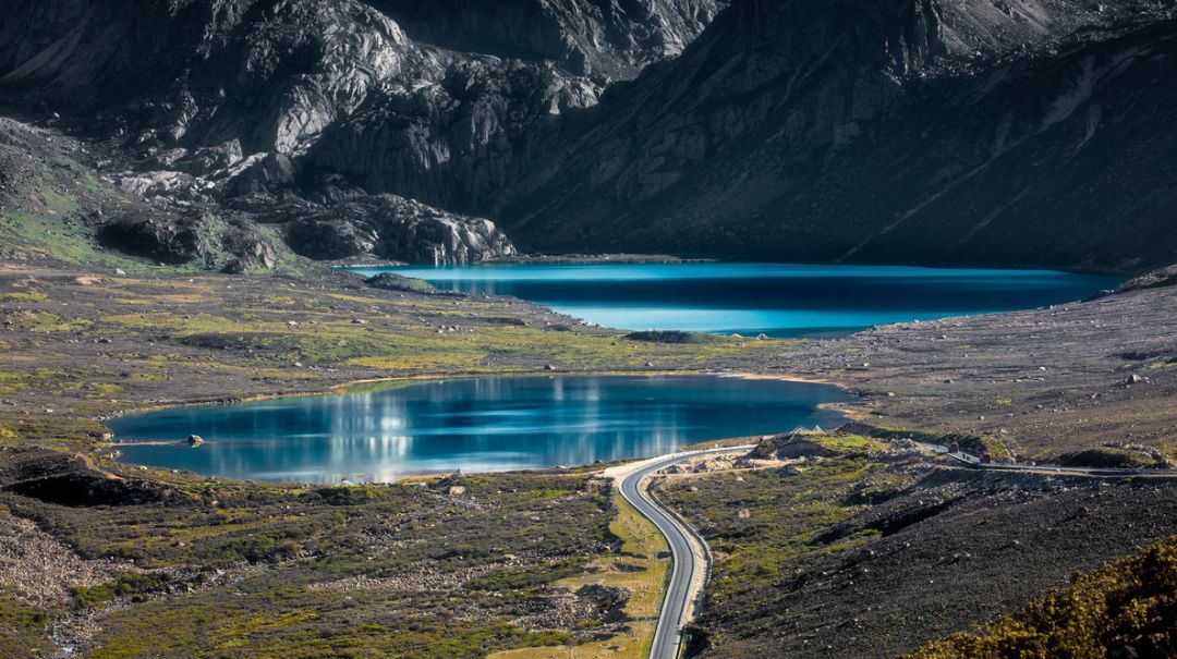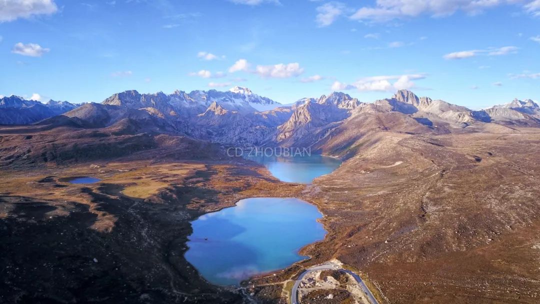 眺望姊妹湖和海子山,两处碧蓝澄澈的高原湖泊紧挨着,如宝石般镶嵌在荒凉山原上。