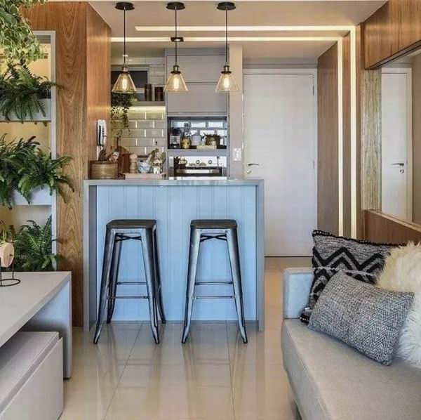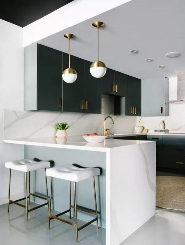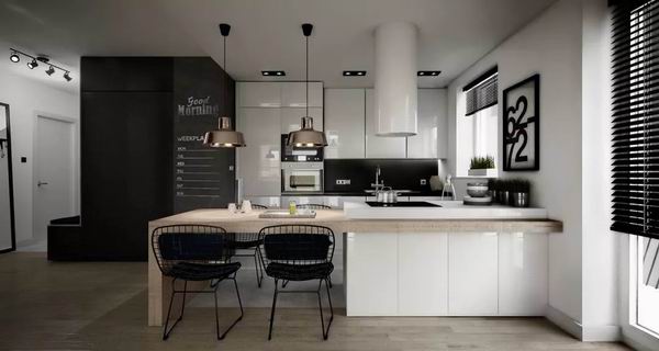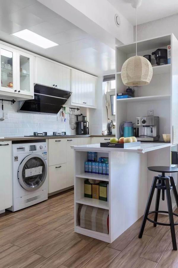 岛台可以设置在两个功能区之间,作为隔断使用。对于小户型可以用半岛式做成酒吧台;稍大的空间可以做成半包式,隔成半开放式厨房。