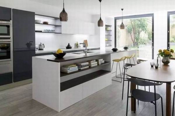 延伸式岛台设计,一般是在一字型的岛台旁加延伸的台面,可充当餐桌使用