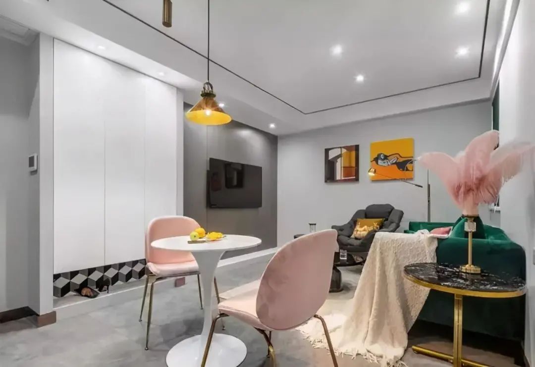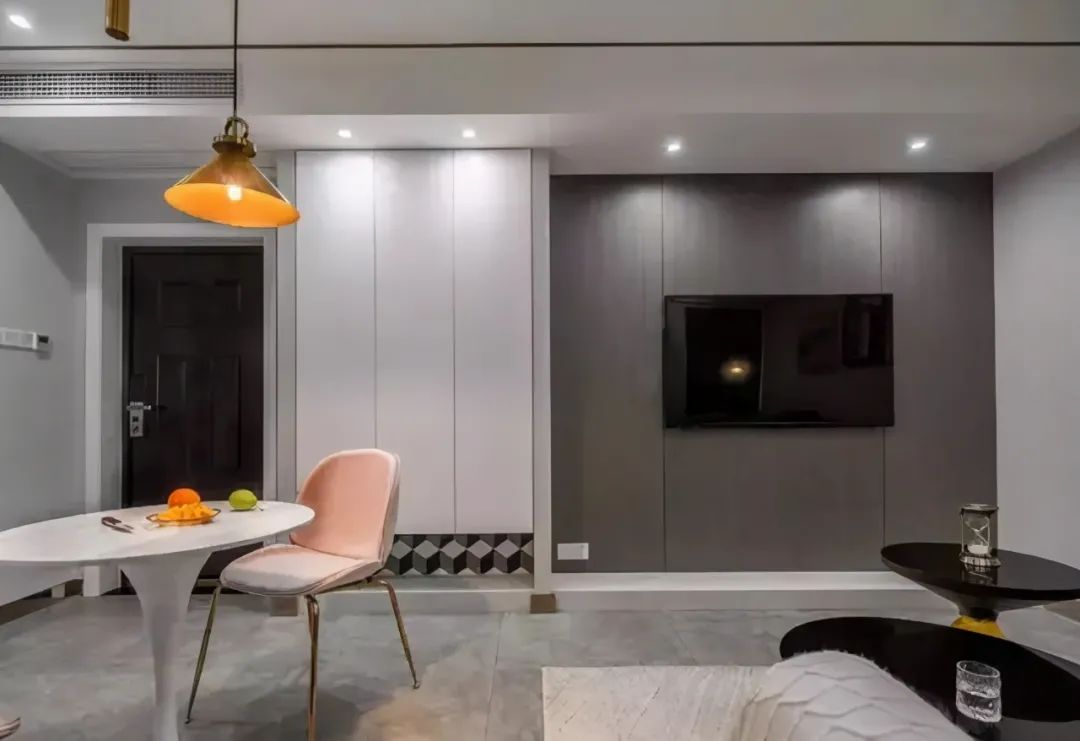 餐厅所占据的空间非常小,迷你的圆餐桌搭配两张粉色带金属的椅子。客厅的电视柜被舍弃,选择了做上大理石造型,简洁的饰面板作为电视背景墙,看着就很有现代感。