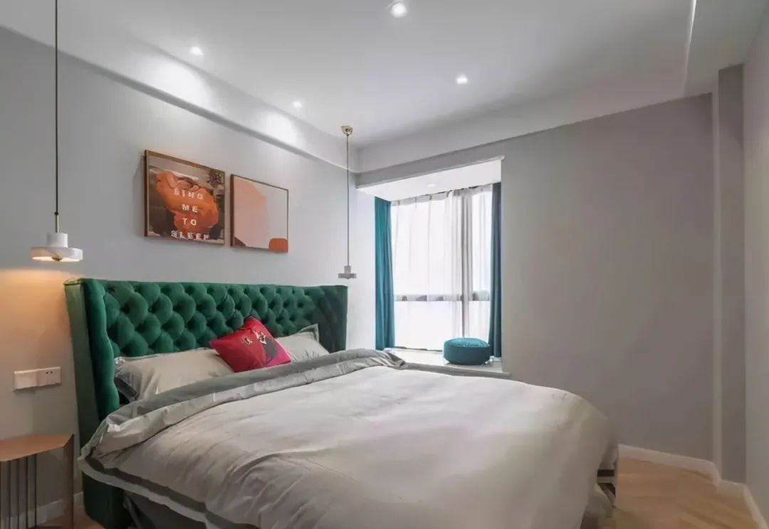 主卧室的背景同样选择了灰色调,孔雀绿的床头靠背款式非常大气。飘窗的窗帘选择了孔雀蓝的色调,整体简洁而又有格调感。