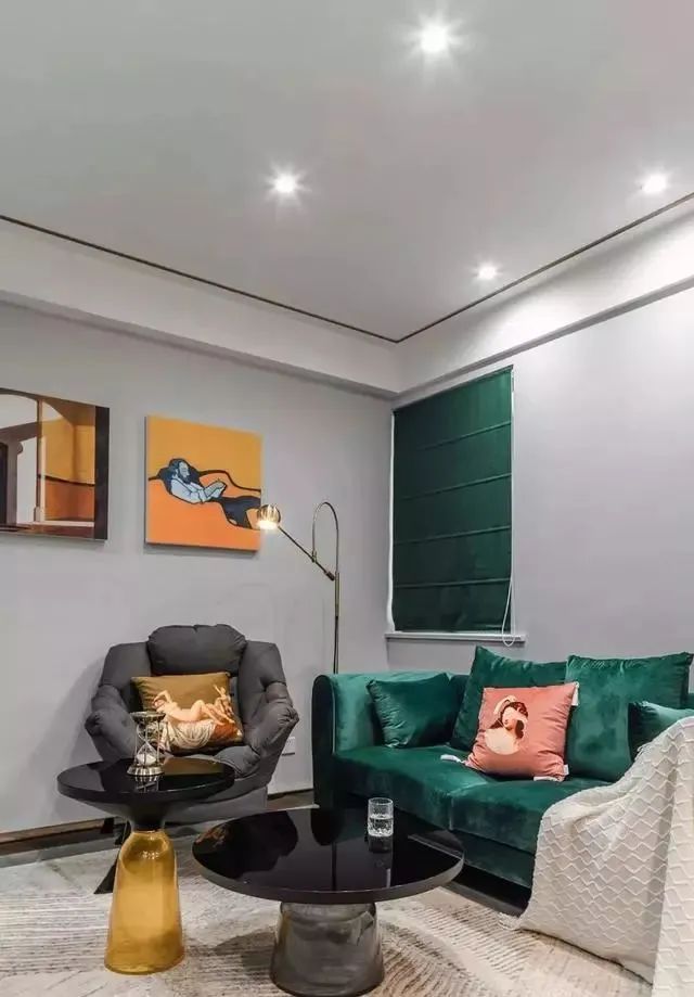 客厅的双人沙发和单椅结合,角落里还摆放了一个铜质金属的落地灯,孔雀绿的沙发搭配镜面的茶几,营造出复古而又优雅的感觉。