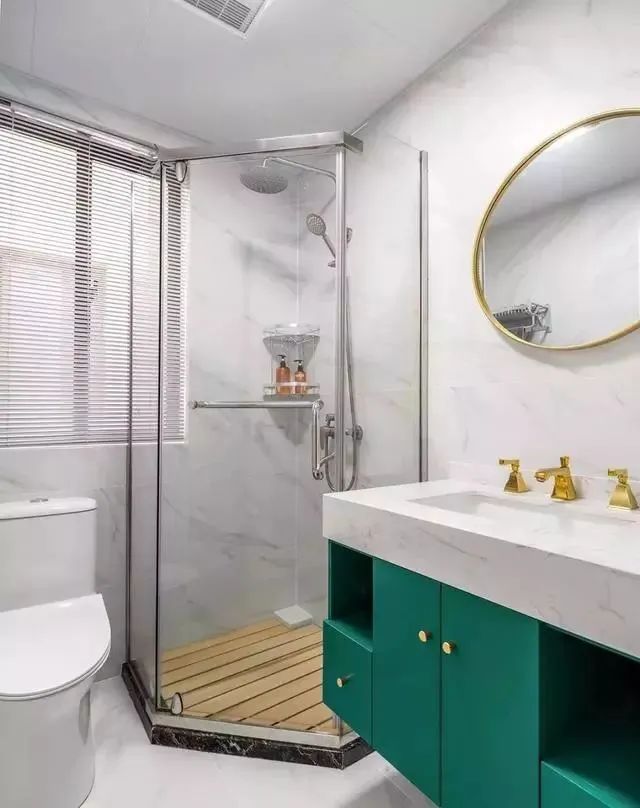 卫生间内部是马桶、钻石型淋浴房、洗手台的三角形布局,干湿分离可以避免水汽的侵蚀,款式复古的浴室柜和细节处的金属元素也让人感觉非常精致。