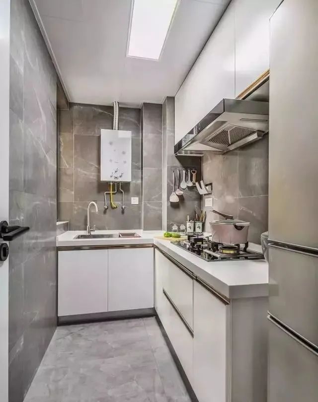 厨房内部空间比较小,做了L形的橱柜布局,冰箱摆放在橱柜的边上。灰色调的大理石瓷砖搭配白色的柜子,让厨房看起来简单又轻松。