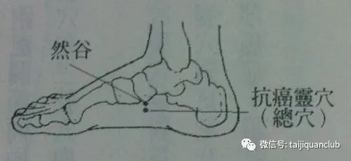 然谷穴是足少阴肾经的常用腧穴之一,出自于《灵枢·本输》,别名龙渊,然骨。在内踝骨往前斜下方2厘米处有个高骨,高骨的下缘就是然谷穴。现代常用于治疗咽喉炎、膀胱炎、尿道炎、月经不调、厌食症等病症,它还是个治疗糖尿病的重要穴位。糖尿病在中医上称为“消渴”。汉代张仲景《金匾》载有:“渴欲饮水不止”“渴欲饮水,口干舌燥”。然谷穴有一个功效,那就是受到刺激以后,会使口中分泌大量的唾液。唾液分泌得多了,口中也就不觉得那么渴了,口干舌燥的症状也就可以得到很好的缓解。所以该穴能治消渴。