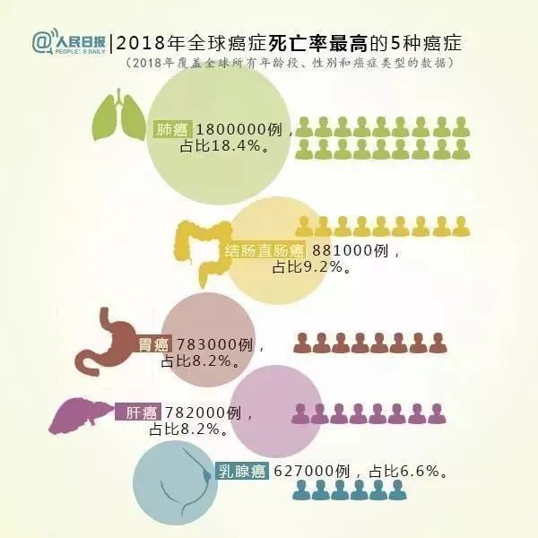 全球死亡率最高的癌症依次为:肺癌(18.4%)、结肠直肠癌(9.2%)、胃癌(8.2%)、肝癌(8.2%)、乳腺癌(6.6%)。