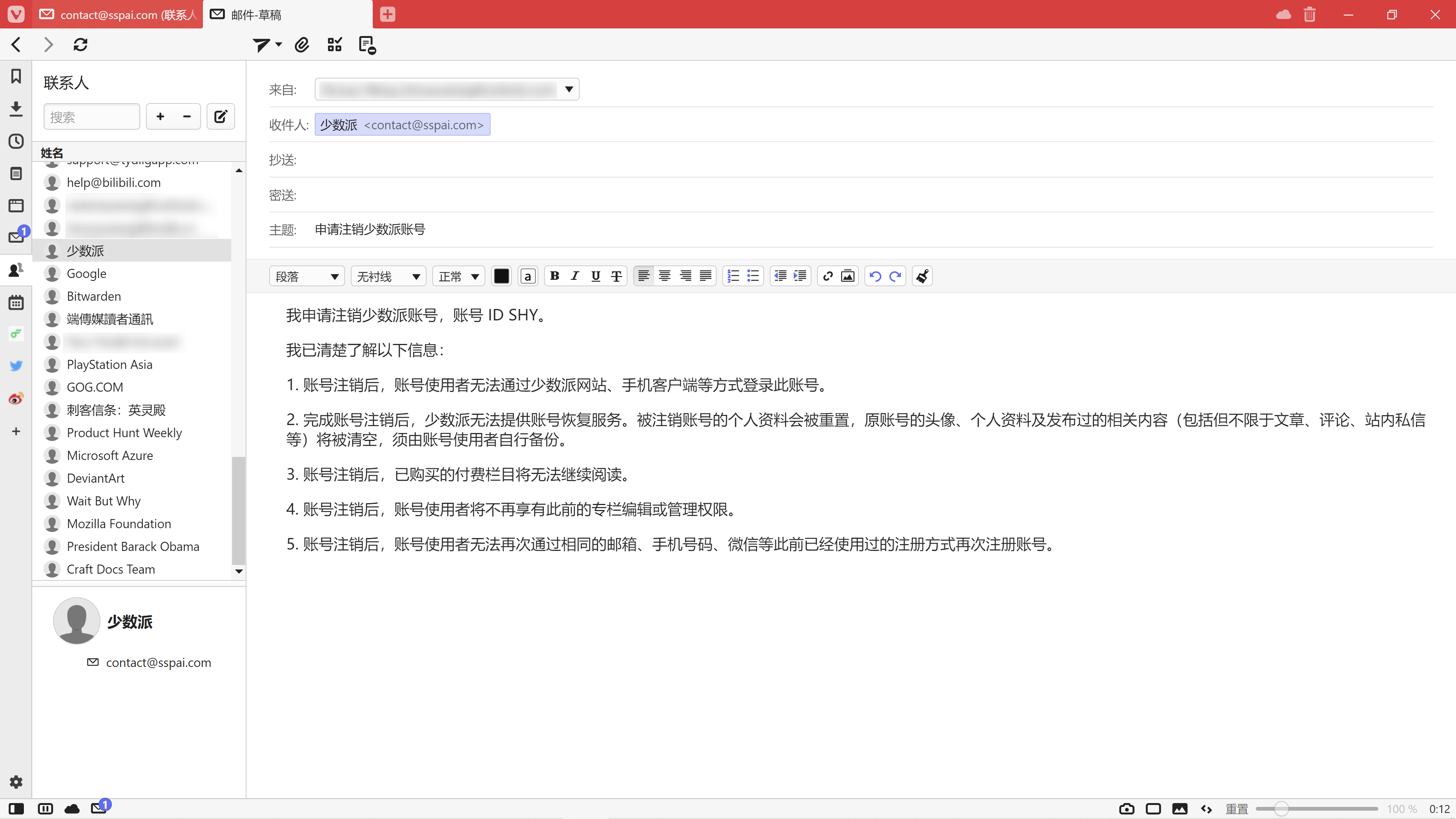 比收邮件更重要的,是发邮件。你不仅能用 Vivaldi Mail 创建一封格式丰富的邮件,还能将任意网页内容直接作为邮件发送,在一定程度上代替笔记应用的剪藏扩展。如果不想现在发送,Vivaldi 允许你将草稿暂存为队列,留待进一步处理。在侧栏中,我们可以管理自己的联系人和所有往来过的邮件地址,查看历史邮件记录或撰写新邮件。