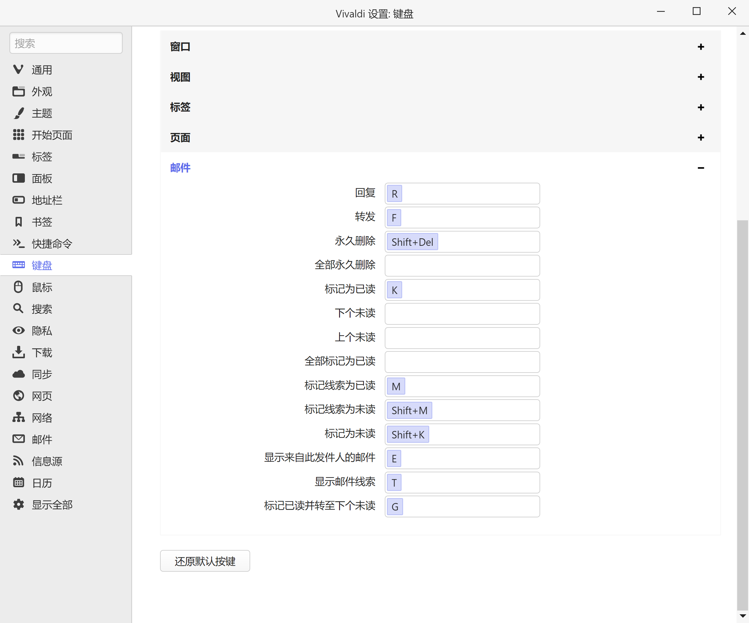 Vivaldi Mail 沿袭了 Vivaldi 一贯的高度可定制性,颜色主题、界面布局、工具栏按钮都随你心意。你可以按收件日期、邮件主题、发件人等属性排列自己的收件箱,也能决定要不要在列表中显示订阅邮件或垃圾邮件。进阶用户不要错过可完全自定义的键盘快捷键,Vivaldi 支持单键触发,工作更高效。不习惯敲键盘的话,所有操作都可以映射为鼠标手势,就是这么方便。