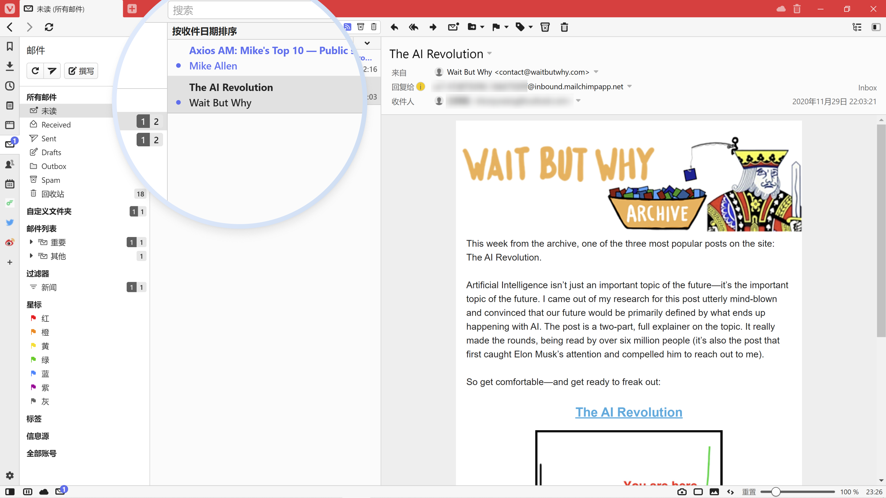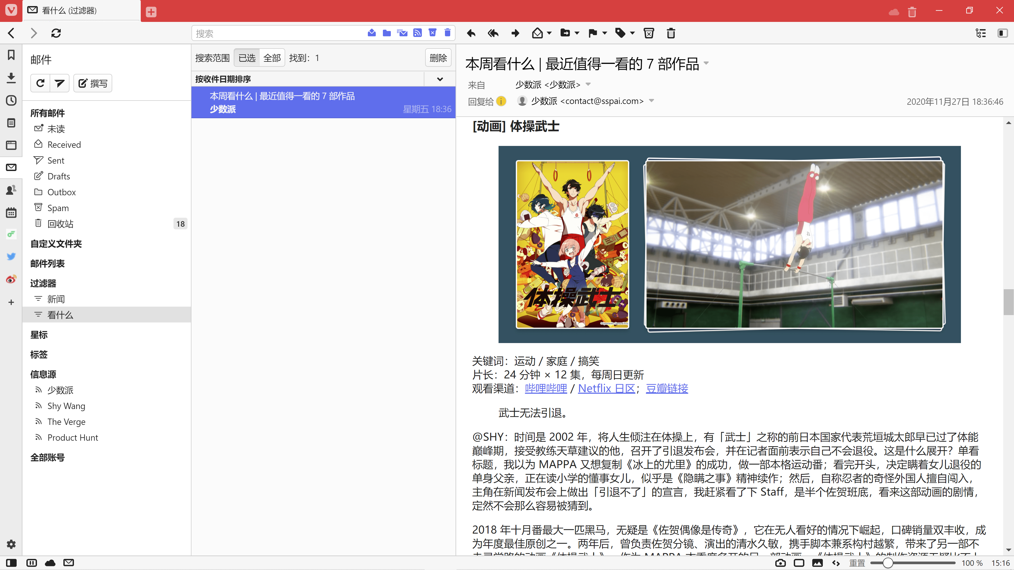 点击订阅,编辑信息源标题,配置刷新周期,然后就能在邮件面板中看到它了。借助旗标和标签,你可以像对付普通邮件一样处理文章,还能直接转发至稍后读服务的邮件地址,完善自己的工作流。这里还有一个小窍门:由于 RSS 被整合在 Vivaldi Mail 中,你创建的邮件过滤器也对它有效,在每天更新数千条的信息流中,只看感兴趣的关键词,这可是 Inoreader 的付费功能。