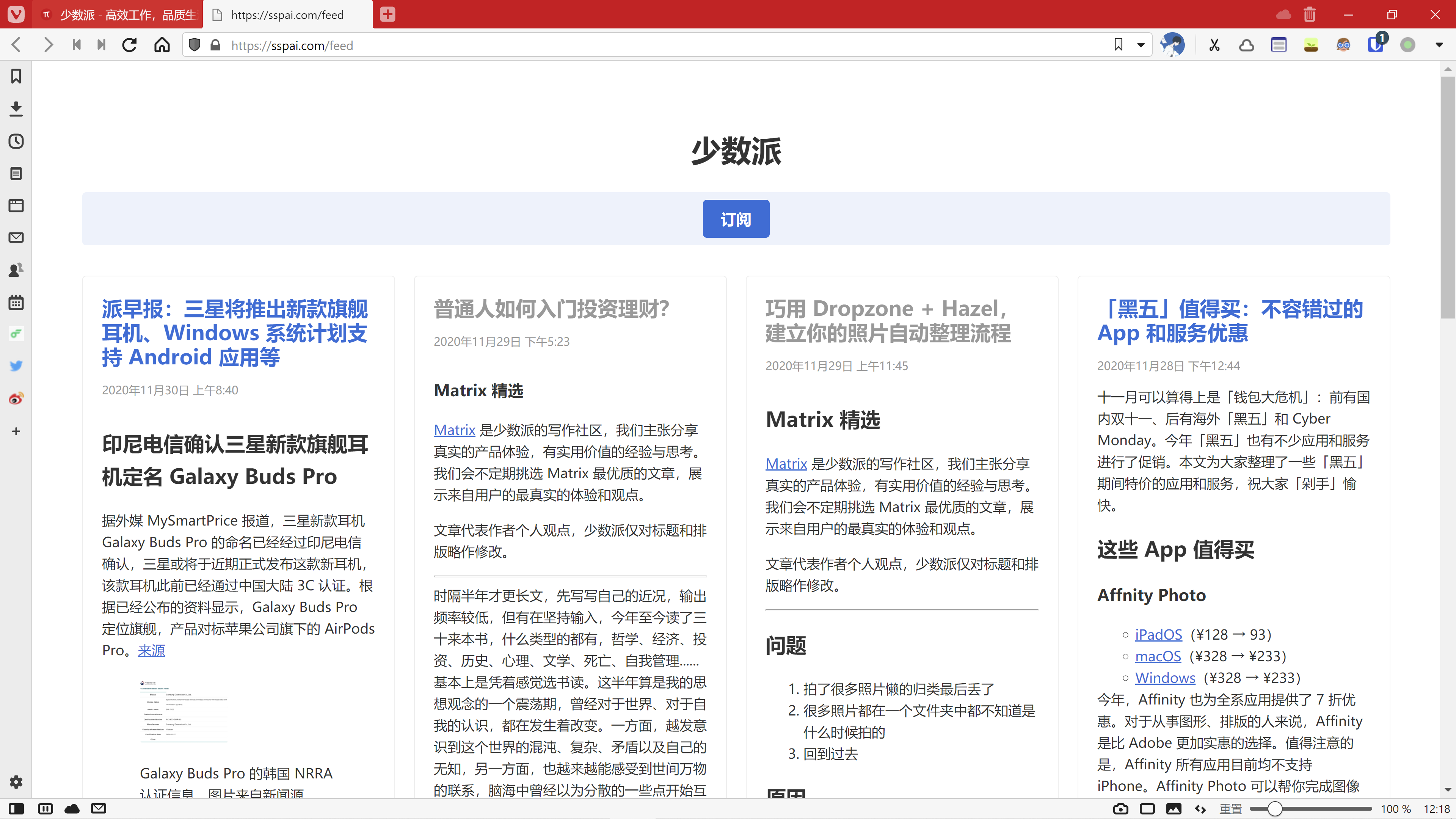 订阅之前,不妨先看看它能提供什么内容。Vivaldi 可以将单调的 XML 文件转换为类似杂志的排版样式,可读性更高。自然,这不局限于在线网站,你还可以直接打开用其它 RSS 服务导出的 OPML 等格式文件,然后直观预览其中包含的信息源列表,一键订阅全部,或者只选择自己想看的部分。
