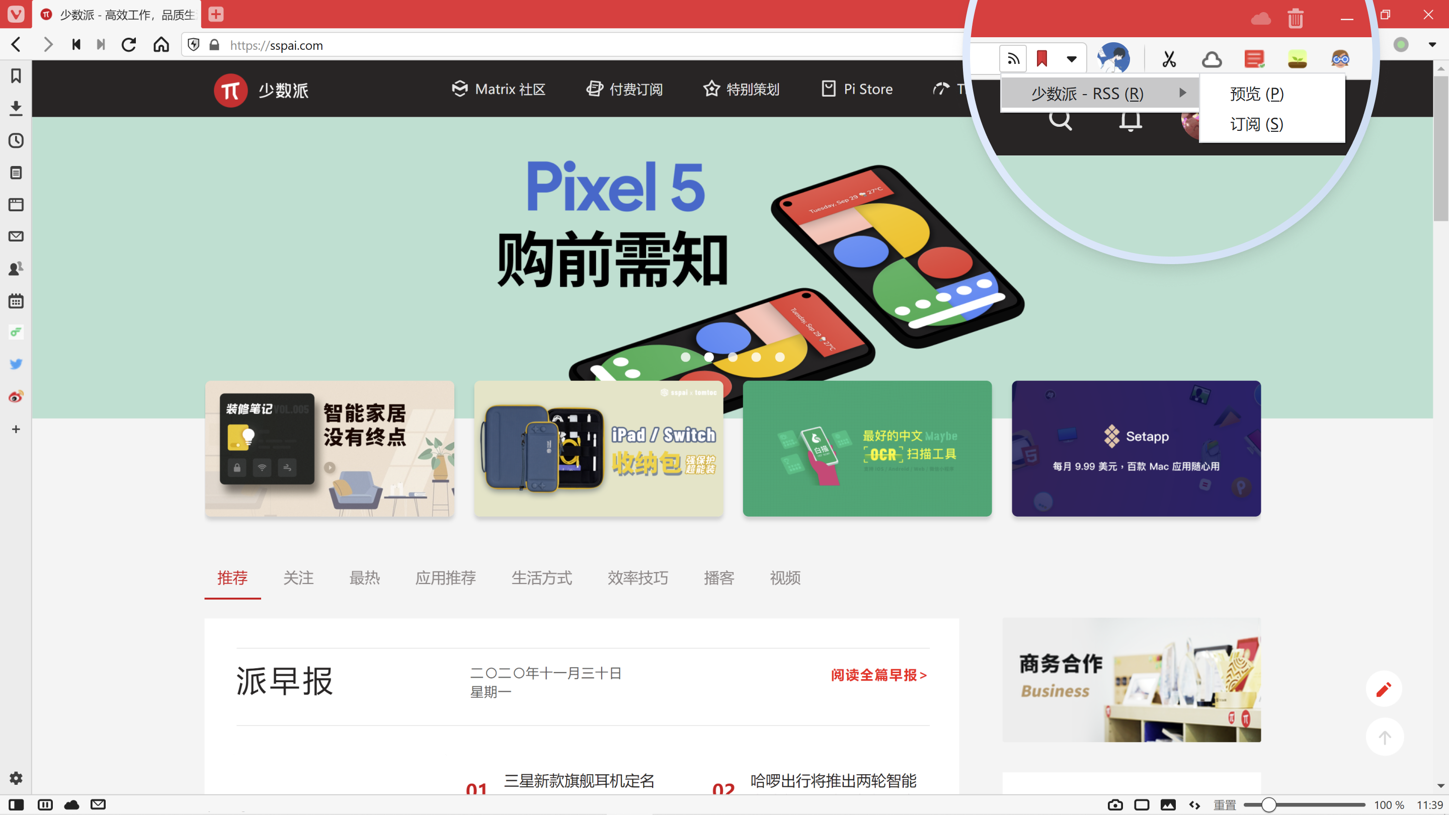 用浏览器订阅 RSS,并不是件新鲜事。然而,2018 年 12 月发布的 Firefox 64 移除「实时书签」功能后,这一传统从此与主流浏览器无缘。不过,同是 Mozilla 旗下的 Thunderbird 邮件客户端 依然允许你订阅感兴趣的内容。Vivaldi Mail 同样整合了一款 RSS 阅读器,而且与浏览器集成,可以自动检测当前网站是否提供信息源,并一键订阅。