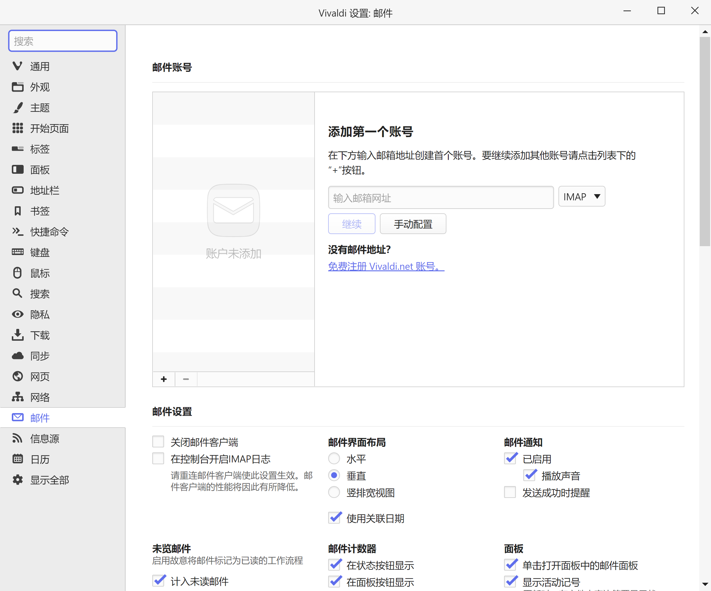 现在,打开设置,你应当会发现多出了邮件、信息源和日历选项。Vivaldi Mail 支持 IMAP 和 POP3 协议,可以自动检测常见邮件服务器配置,免去手动填充的困扰。对了,如果你已经注册 Vivaldi 账号的话,还会自动拥有一个 @vivaldi.net 的免费邮件地址,验证手机号码即可开始使用。