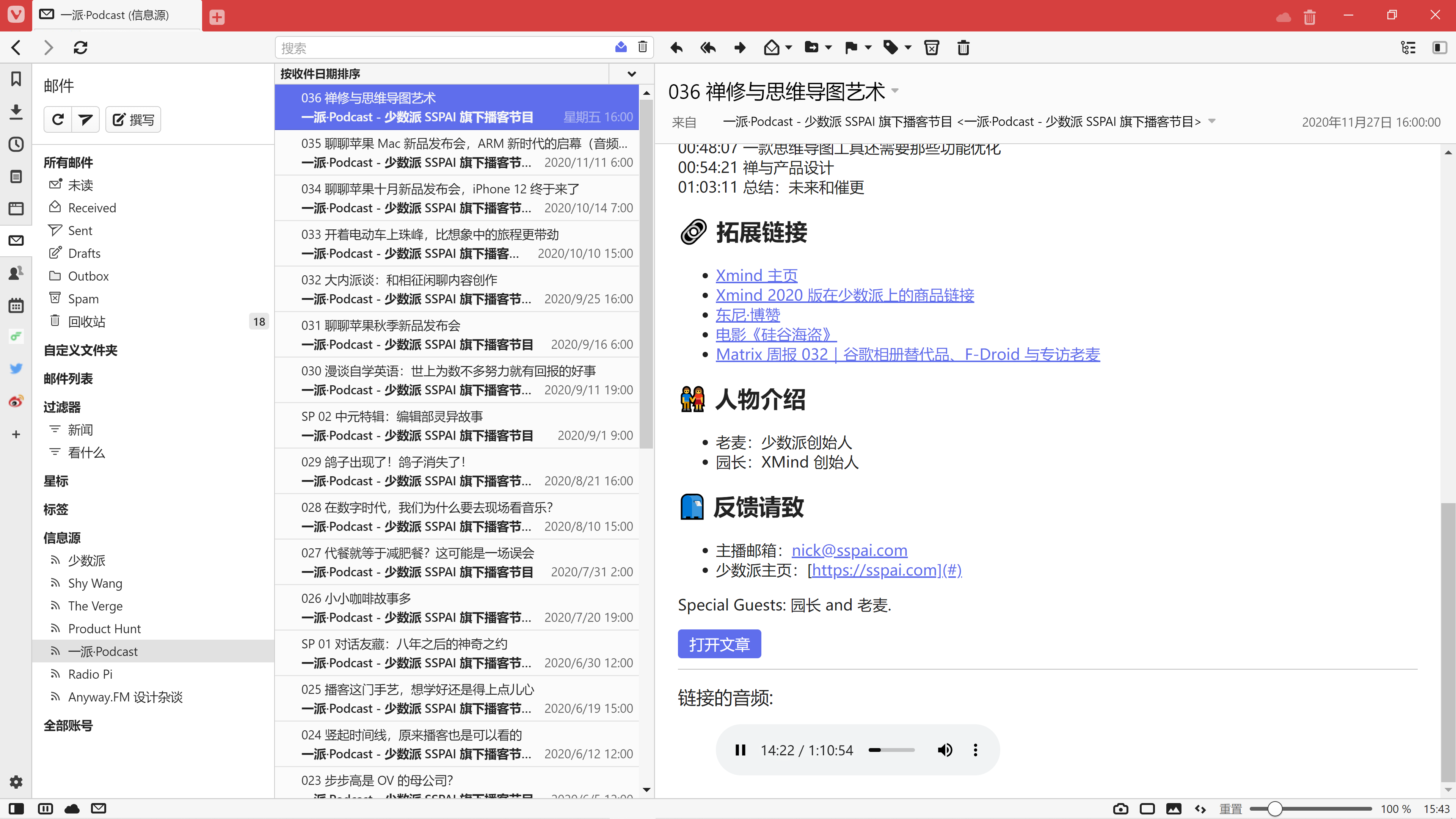 虽然没怎么做优化,但 Vivaldi 还可以成为一款泛用型播客客户端,方法也很简单,找到播客的 RSS 地址,点击订阅即可。Show Notes 会像普通文章一样渲染,音频则附在文末,点击即可收听。当然,我更推荐使用 Pocket Casts 等专业工具,但如果你只是偶尔听一期,又不是不能用,对吧。