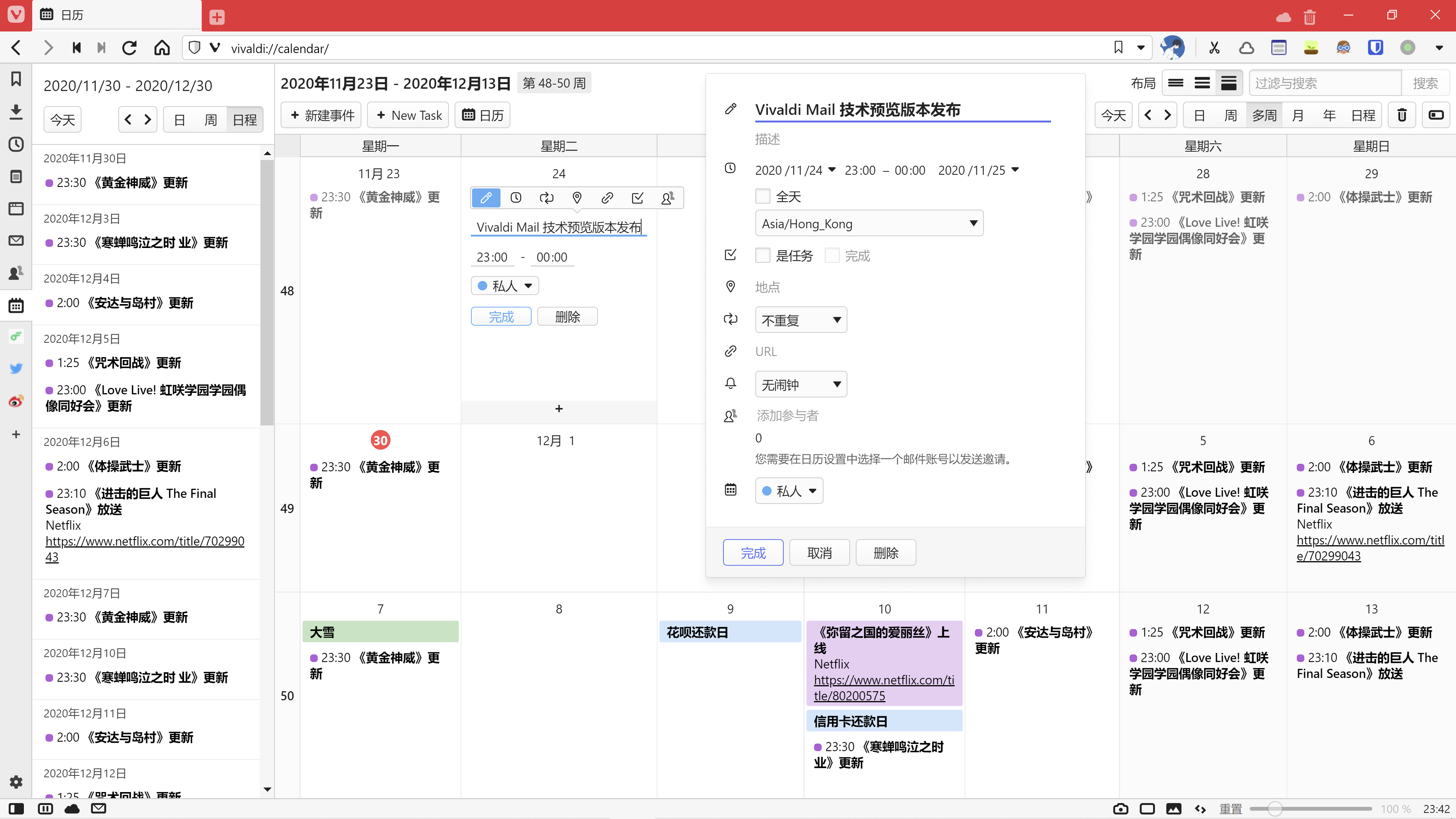 Vivaldi 日历的另一特性,是行内编辑,点击任意空白处,或者按下配置的快捷键,输入事件标题,回车,便大功告成。如有需要,你也可以添加地点、链接、循环,并邀请其他人参加。觉得空间太小施展不开,打开日历设置,将编辑模式改为 Dialog,传统的弹出窗口就出现了。不要忘了,Vivaldi 还是浏览器,选中任意网页中的文字,也能将它添加为日历事件,只可惜不能识别日期,还需再接再厉。