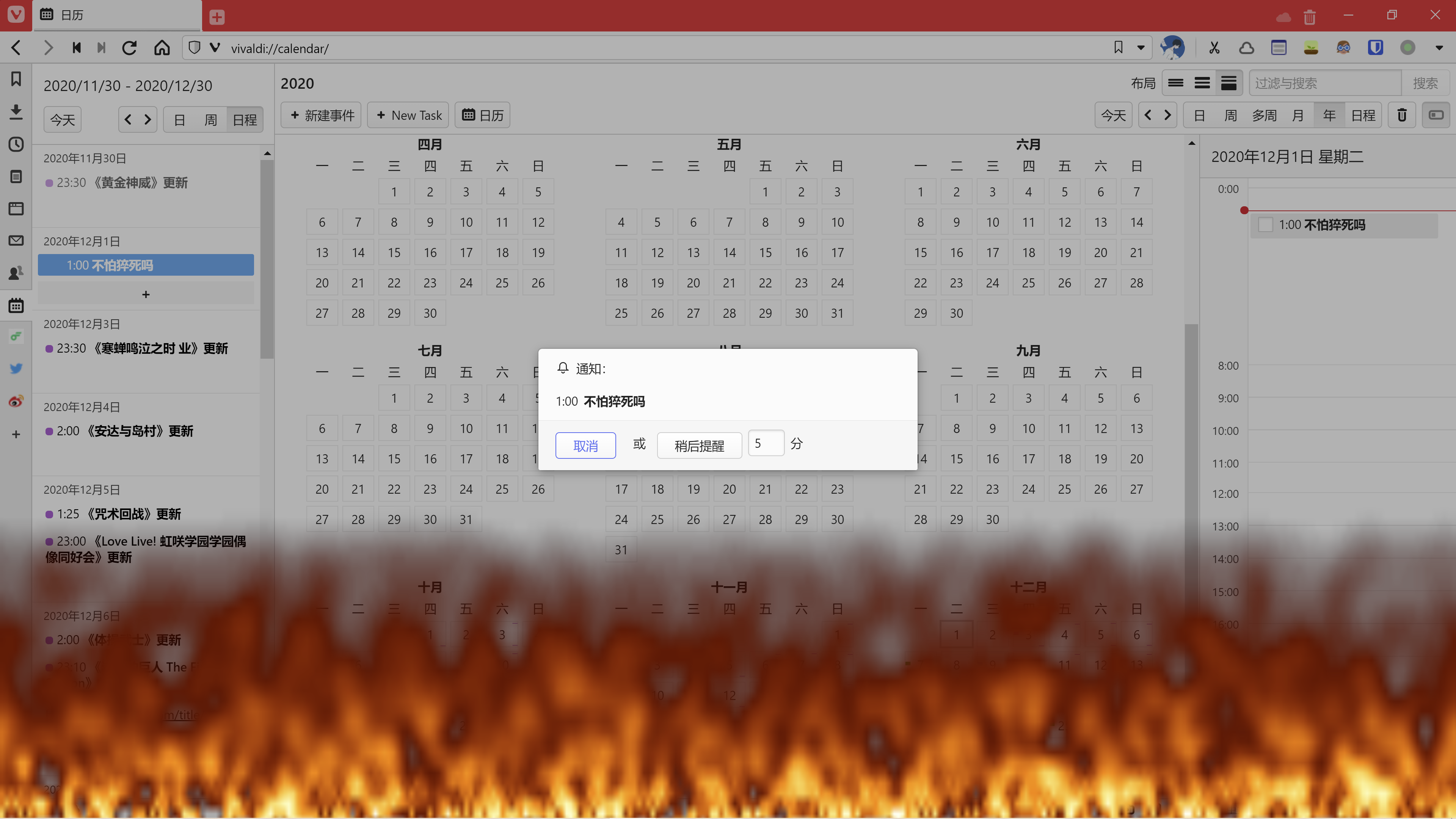 日程规划和任务管理,本就如出一辙,不妨将日历事件标记为任务,督促自己按时完成。要做到这一点,通知提醒必不可少,打开设置,除了系统通知和浏览器内通知两个一看就懂的选项,还有「融入浏览器」和「燃烧浏览器」两种通知样式。不用多想,就是字面意思,前者会让屏幕如雪崩般瓦解,后者会直接升一团火,绝不会错过。