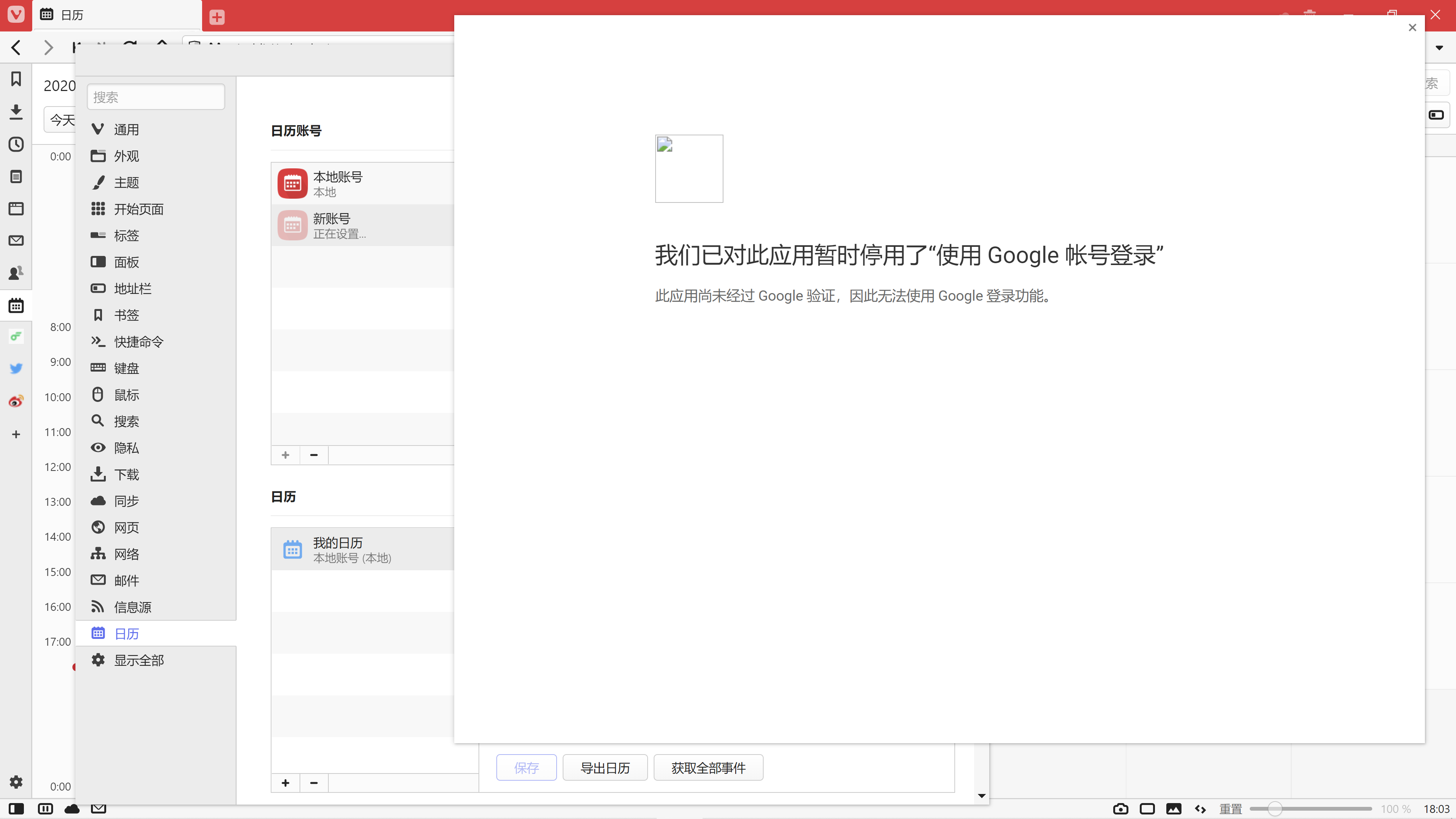 日历,是 Vivaldi 本次更新的另一重点,不仅常驻侧栏,还在开始页面拥有一席之地。Vivaldi 日历支持与自家的 Vivaldi.net、Google 日历、CalDAV 和其它网络日历同步。我本来想夸两句,却发现咕咕噜暂时停用了 Vivaldi 的登录权限,只能期盼尽快解决了。当然,这并不妨碍我创建几个本地账号,并试试它有什么特别之处。