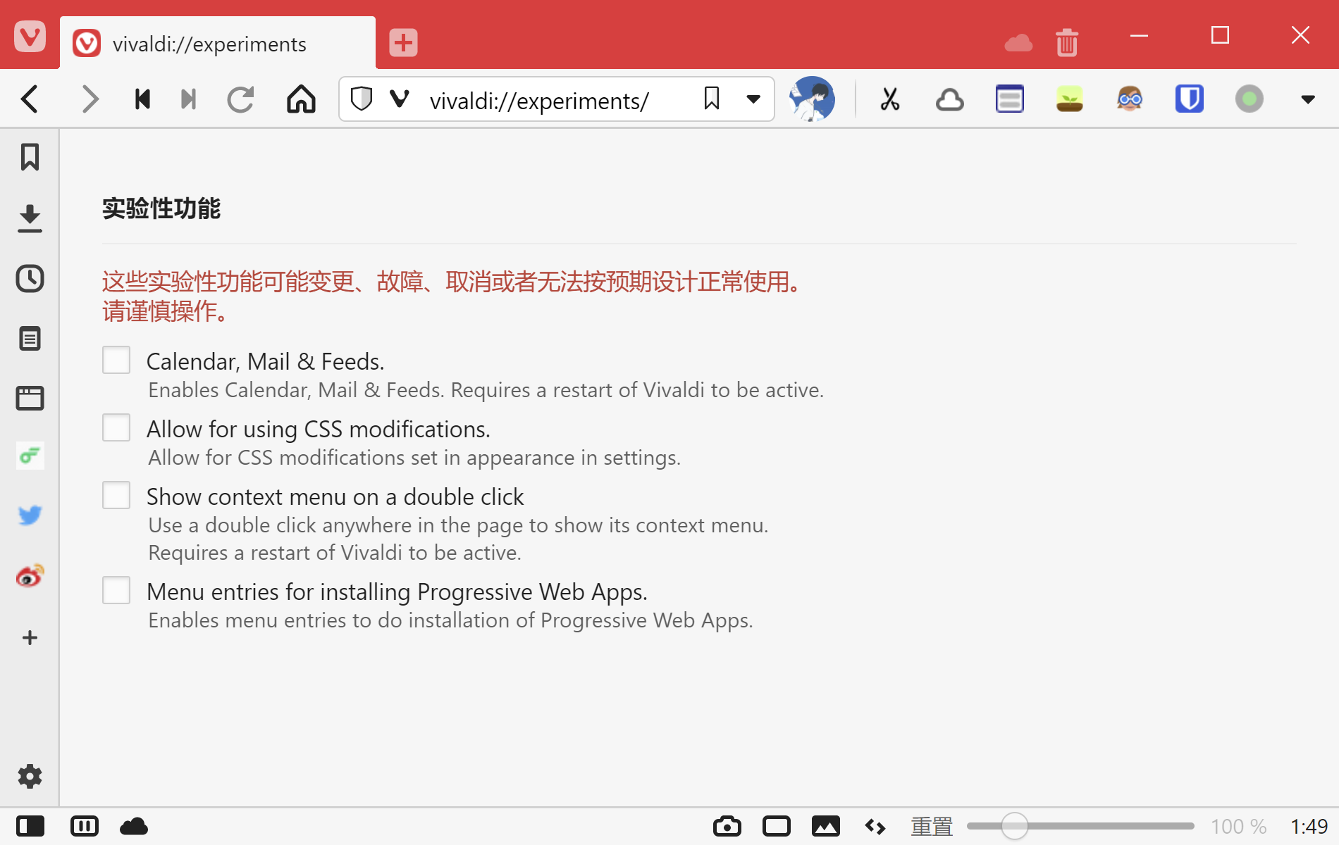 目前,Vivaldi Mail 仍处于技术预览状态,因此,我们需要下载 最新桌面快照版本。出于稳定性考虑,如果你的默认浏览器是 Vivaldi,请慎重尝鲜。安装后,在地址栏输入 vivaldi://experiments/ 并回车,勾选「Calendar, Mail & Feeds」,然后重启浏览器,就能在侧栏面板中看到邮件、联系人和日历的图标了。