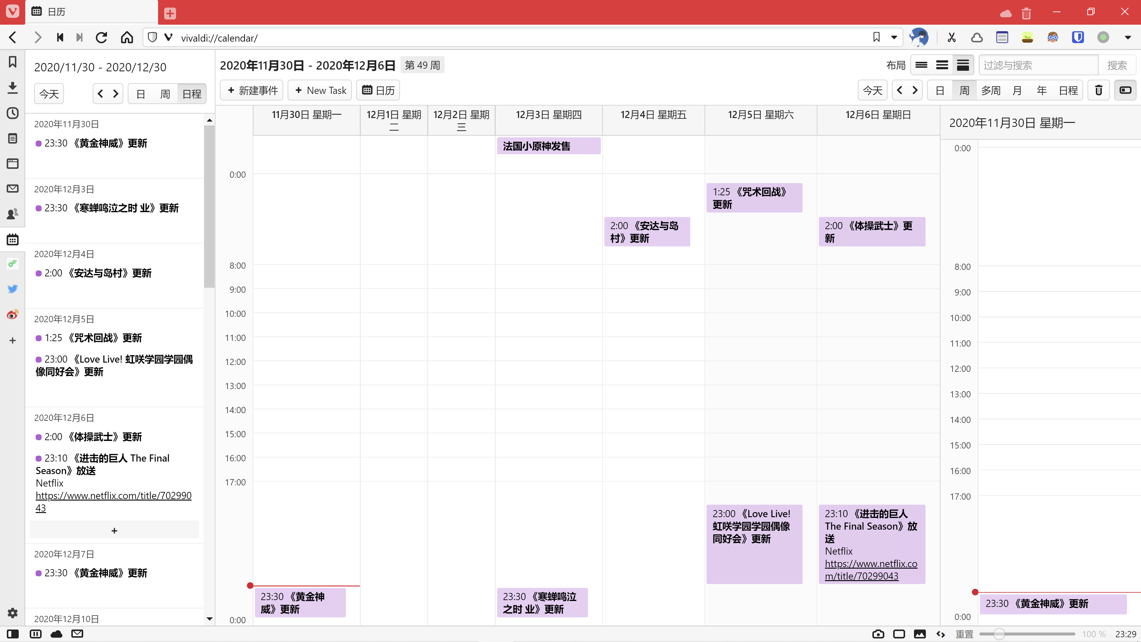 一眼看过去,Vivaldi 日历的界面似乎和同行没有多大区别:中规中矩的格子间,熟悉的日、周、月、年和日程视图,要说哪里不一样,大概是可以同时拥有左右两个侧栏,从而在同一屏中纵览三种视图。仔细观察的话,你会发现,Vivaldi 会智能调整网格宽度,以适应当天事件的标题。如果每天都被日程塞满,你还可以调整布局密度,不错过任何约会。