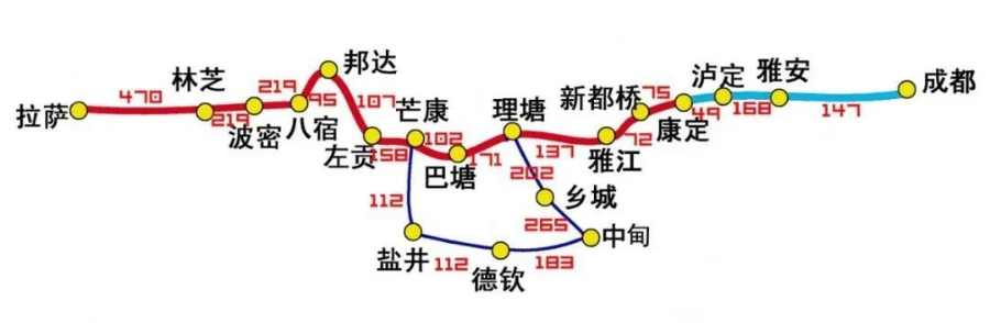 线路(南线):成都→雅安→泸定→康定→新都桥→理塘→巴塘→芒康→左贡→邦达→八宿→然乌→波密→林芝→八一→墨竹工卡→拉萨