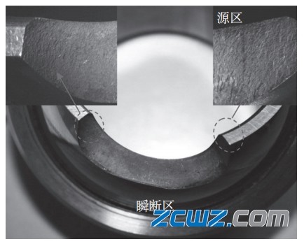 经过宏观和微观检查,以及金相检测得知,轴承内圈的掉块断口形貌平齐,扩展棱线清晰,源区、扩展区及瞬断区明显,无宏观塑性变形,无腐蚀特征。由以上特征可以判定,轴承掉块的性质为疲劳断裂。
