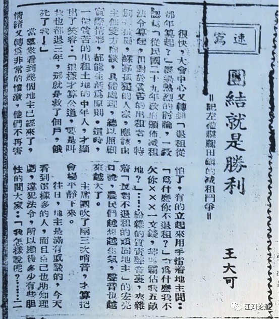 此文原载1942年12月5日《新华日报》(华北版)4版,署名“定”。文章左上方刊登有一则“速写”,标题为《团结就是胜利》,署名王大可。