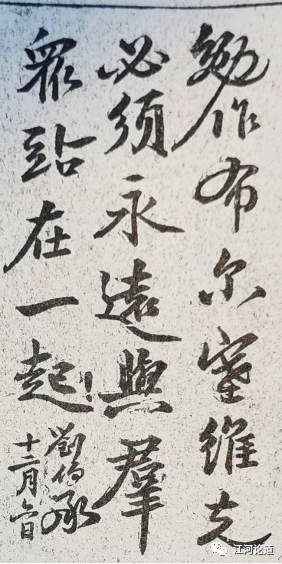 【刘伯承将军于1942年12月6日书写的“勉作布尔什维克,必须永远与群众站在一起。”,刊登于1942年12月15日《新华日报》(华北版)上。】
