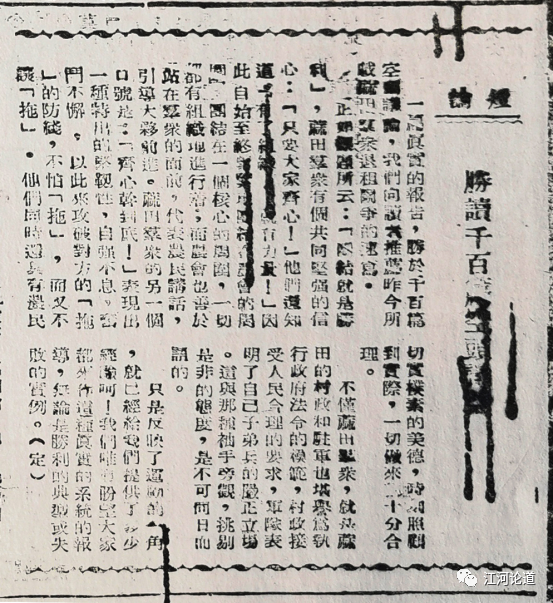 此文原载1942年12月4日《新华日报》(华北版)4版,署名“定”。文章左上方刊登有一则通讯,标题为《左权失粮三千石》:全文如下