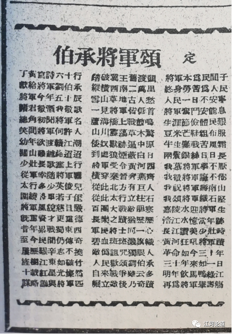 1942年12月15日《新华日报》(华北版)“庆祝刘伯承将军五十寿辰特刊”上,有首60行长诗《伯承将军颂》,署名“定”。全诗如下: